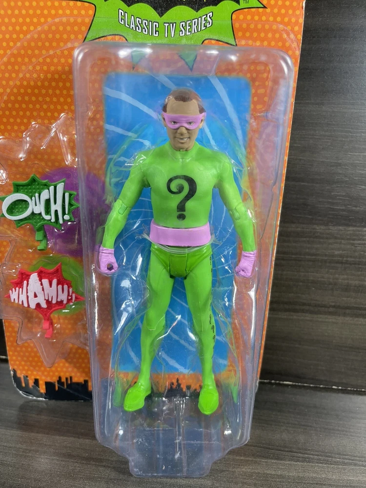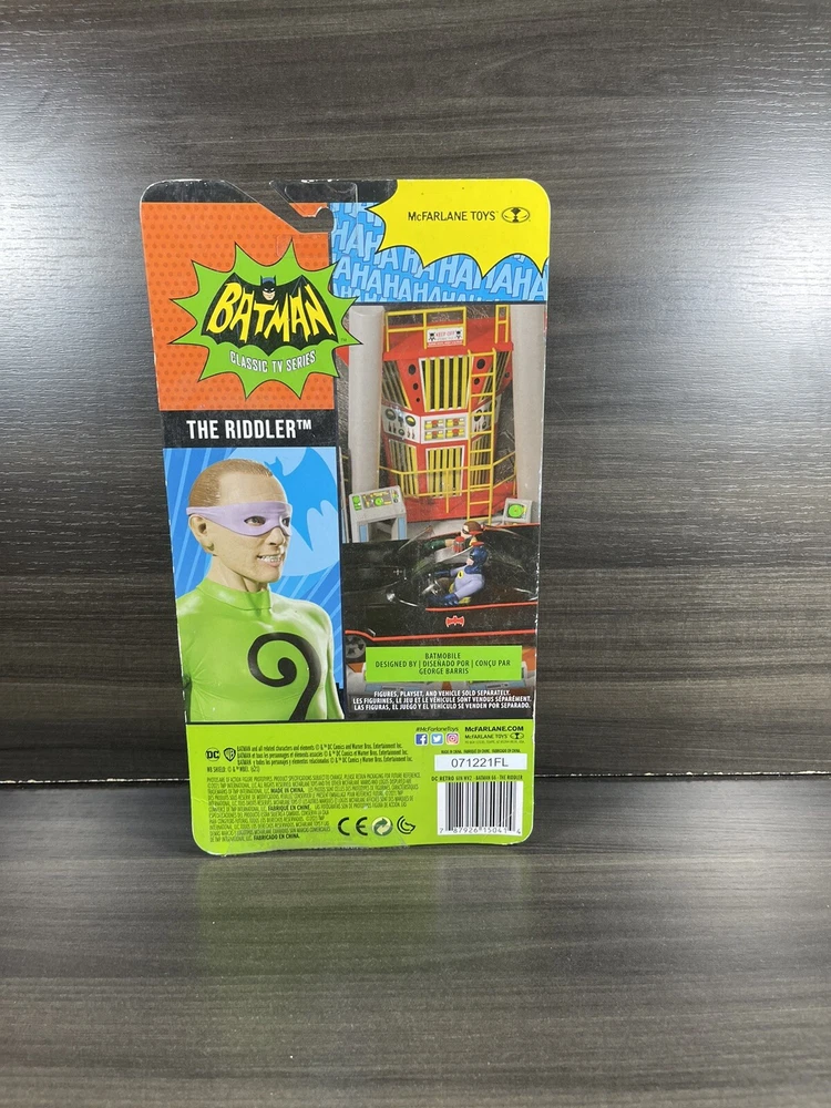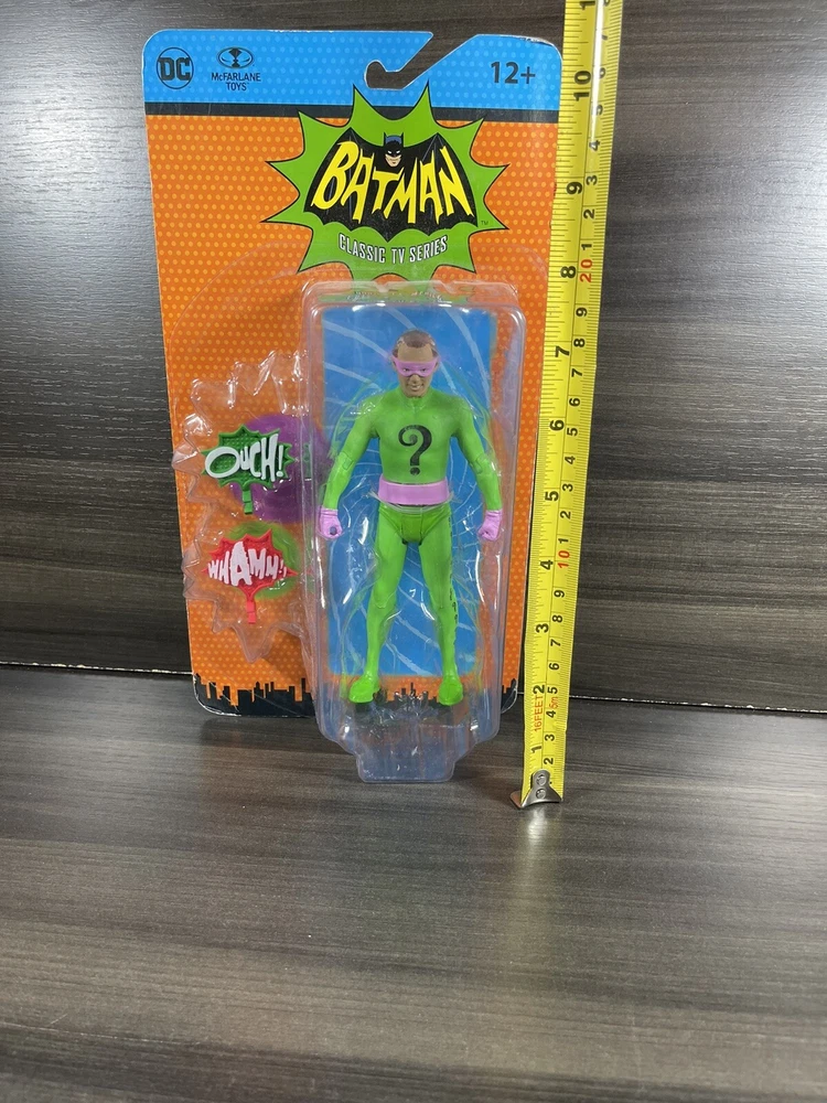 Add this classic 1966 Batman TV series action figure of The Riddler to your collection today! This McFarlane Toys figure stands at 6 inches tall and is made of durable plastic material. The colorful design and intricate details make this figure a must-have for any Batman fan. Featuring the iconic character as played by Frank Gorshin, this action figure is in its original packaging and has never been opened. Perfect for display or play, this vintage-inspired piece is a great addition to any collection. Don't miss out on the chance to own a piece of Batman history. Ships from Dallas, Texas.
