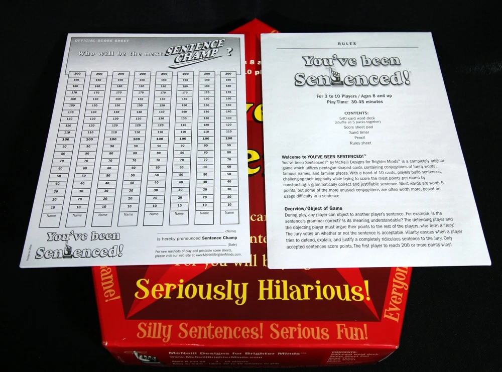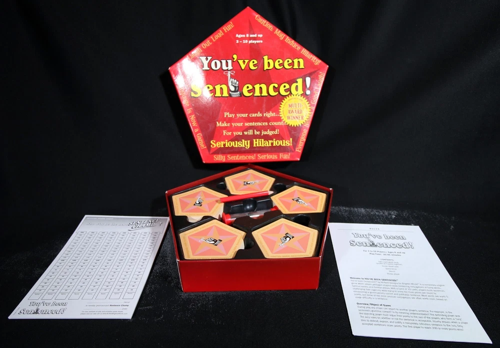 This complete game, from McNeill Designs titled "You've Been Sentenced," is a fun and challenging strategy game for families, with a recommended age range of 8+. The goal of the game is to create sentences and then have all the other players judge them. The defending player must justify their sentence. There will, quite possibly, be sentences that have never been uttered before, in history, and trying to justify them is what the game is all about. The game includes a deck of cards, a score pad, and instructions to make it easy to start playing right away. The game, manufactured in China, has won the 2007 Creative Child Magazine Seal of Excellence award. This game is a great addition to any family game night and is sure to provide hours of entertainment. Each item we ship is carefully packaged to prevent any damage and is shipped immediately with tracking.