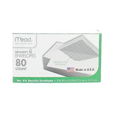 Product Description Mead 6-3/4 Security Envelopes. Keep sensitive information confidential. Keep prying eyes off of your important documents with this number 6-3/4 security envelope. It has a printed lining for privacy, so it''s ideal for sending confidential mail, and the V-flap is fully gummed for a secure seal. Each envelope is constructed from 20-lb. bond paper. The 6-3/4-inch style and size is best for checks and brief notes. From the Manufacturer Keep prying eyes off your important documents with this No. 6.75 security envelope with a security tint. The printed lining for privacy is ideal for sending confidential mail. Diagonal flap is fully gummed for secure seal. Each envelope is 20 lb. White envelopes with security lining ensure privacy 6-3/4 size envelopes measure 3-5/8" x 6-1/2" 80 envelopes per box. Customizable: No 20 lb. paper. Made in United States
