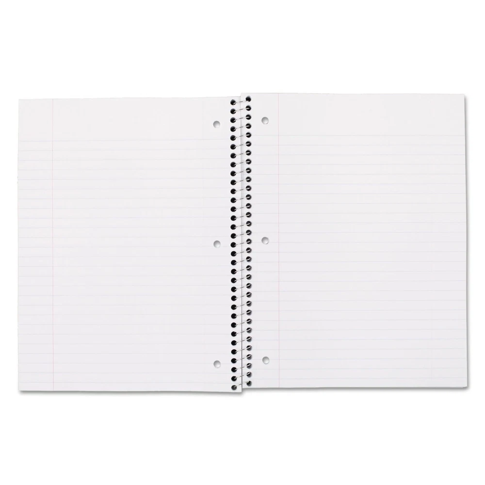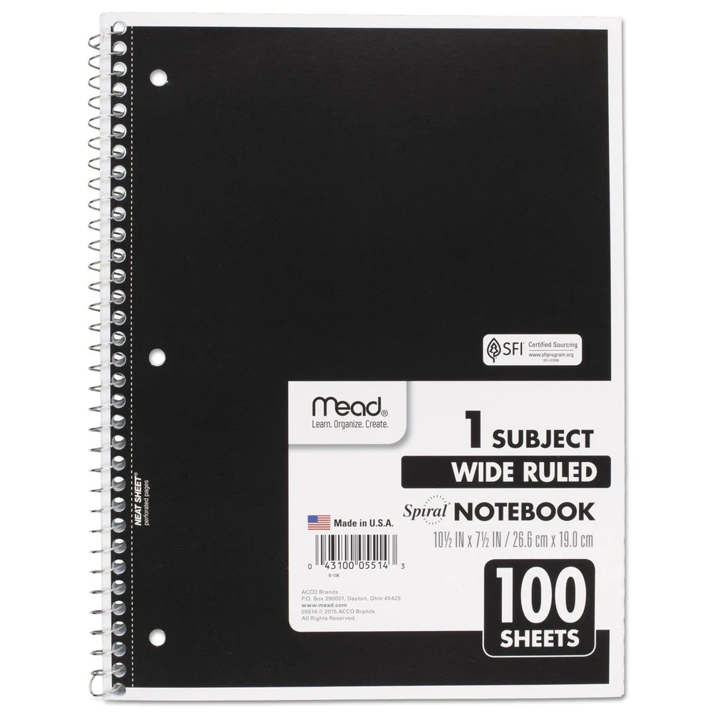 Mead Spiral Notebook,1-Subject,Wide Rule, 8 x 10-1/2, 100 Sheets (1 Pack) Spiral binding for smooth page turning. Double-sided, ruled paper. Durable, coated paper cover. 3-hole punched to store in your favorite binder. Great for color coding by subject. Notebook spiral binding will not snag and resists uncoiling to keep your notes together. One-Subject Format—Three-hole punched. Pocket-Sized Indicator: N; Book-Binding Type: Spiral Coil; Book-Binding Edge: Side; Cover Color: Randomly Assorted. About this item Perfect to use for 1 subject, this spiral notebook comes in handy for your favorite class or any project With 100 wide ruled, double-sided sheets, there’s plenty of notetaking space. Pages are perforated so they easily tear out with clean edges. Notebook is 3-hole punched for storage in your favorite binder. This allows you to keep all your work organized and in one place. Spiral binding will not snag and resists uncoiling to keep your notes together. Notebook covers are coated for durability. Sheets measure 10-1/2" x 7-1/2" when torn out. Overall size of 10-1/2" x 8". Available in assorted colors: Red, Blue, Green, Yellow, Purple, Black. Please note: color choice is not available for this item, color shipped to you is selected at random, and will vary.
