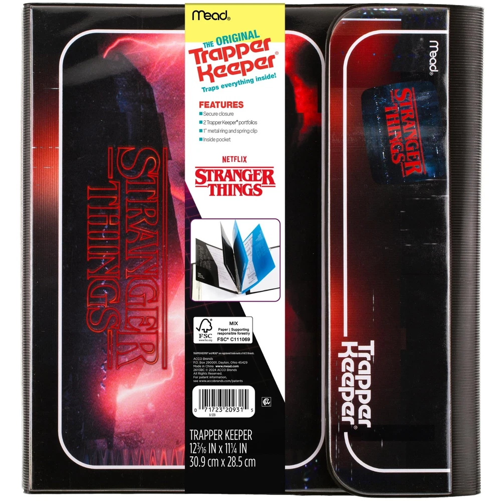 Mead Trapper Keeper Binder, Stranger Things, 1 Inch Binder 1 inch, Creatures Description Get ready for the ultimate adventure. The Trapper Keeper STRANGER THINGS Creatures Binder helps you stay organized even when face-to-face with otherworldly monsters. No need to fear the Upside Down. The hook and loop closure helps trap all your stuff inside – even if you drop it! Two folders help keep your papers secure. Each folder has a vertical pocket that holds loose sheets so they won't fall out. Common stats are printed right on the folders, so you don't forget the basics. Store the folders and other 3-hole punched sheets in the sturdy 1" metal binder rings. A metal clip on the back of the Trapper Keeper secures loose papers and notes while on the go. Store even more in the inside pocket, perfect for keeping handouts, character sheets and extra paper close at hand. STRANGER THINGS is a trademark/copyright owned by Netflix. Used with permission. Upside Down Pictures. Monkey Massacre Productions. 21 Laps. Shawn Levy. Features: It's a creature double-feature. Stay organized even when face-to-face with otherworldly monsters. No need to fear the Upside Down. The hook and loop closure helps trap all your stuff inside – even if you drop it! Two folders help keep your papers secure. Each folder has a vertical pocket that holds loose sheets so they won't fall out. Common stats are printed right on the folders, so you don't forget the basics. Store the folders and other 3-hole punched sheets in the sturdy 1" metal binder rings. A metal clip on the back of the Trapper Keeper secures loose papers and notes while on the go. Store even more in the inside pocket, perfect for keeping handouts, character sheets and extra paper close at hand Product Details: Handling We will ship all orders within 3 business day of payment. Delivery We Do Not Ship Outside of the Continental US. Return Policy All items qualify for returns within 30 days of receipt. Buyer is responsible for return shipping on any item that is not damaged. Feedback We take our reputation seriously, we buy and sell online, so we understand the value of trust. If you are unsatisfied with your order, please contact us and we will work with you to resolve it to your satisfaction.