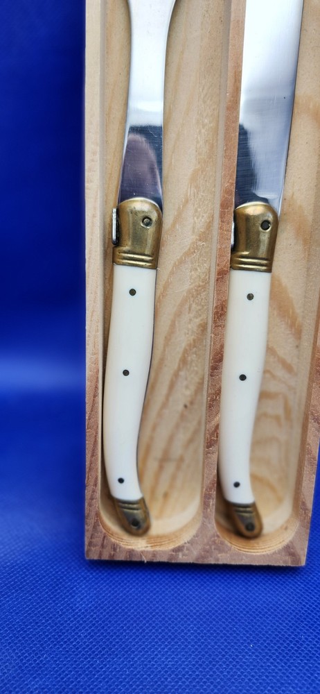 Elevate your dining experience with this exquisite Meat Carving Set by Laguiole. Crafted in France, this set includes two pieces - a Steak Knife and a Carving Fork, both with ivory-colored handles and brass accents. The blades are made of high-quality stainless steel, measuring 11 inches in length. This set is perfect for anyone who loves to cook and wants to make carving meats a breeze. The handle material is comfortable to hold, and the set is specifically designed for meat compatibility. Add a touch of elegance to your kitchen with this Laguiole Meat Carving Set.