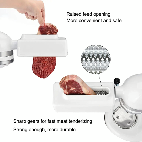 About this item Transform your kitchen and elevate your cooking with the Meat Tenderizer Attachment for KitchenAid Household Stand Mixers . Designed to fit seamlessly with all KitchenAid stand mixers, this high-quality mixer accessory is a must-have for every home chef who loves tender meats and flavorful meals. Whether you're preparing steaks, chicken, or pork, this attachment helps you achieve the perfect tenderness for all your favorite dishes. Made with durability and efficiency in mind, this meat tenderizer attachment effortlessly tenderizes meats without the hassle of manual work. It ensures even penetration of tenderizing blades, breaking down the fibers of meat and making it easier to cook, season, and enjoy. From juicy steaks to easy-to-cook chicken, this attachment saves you time and effort while delivering professional-grade results. Not only is this meat tenderizer accessory durable, but it’s also easy to clean, ensuring that you have more time to enjoy your meals rather than cleaning up after cooking. The convenient design allows for quick and easy attachment to your KitchenAid stand mixer, making it perfect for busy kitchens and chefs looking for convenience and high-quality results. If you love preparing tender meats but dread the long, tedious process of manual tenderizing, this KitchenAid meat tenderizer is your solution. It helps you cut down prep time while ensuring every cut of meat is tender and flavorful, giving you the perfect cooking base for any recipe. Key Features: Universal Fit : Compatible with all KitchenAid Household Stand Mixers for added convenience. Efficient Tenderizing : Tenderizes meat quickly and evenly, making it easy to cook and season. Durable Construction : Built to last with high-quality materials that withstand regular use. Easy to Attach & Clean : Quick and easy installation with minimal cleanup required. Perfect for Home Chefs : Achieve restaurant-quality tender meat in the comfort of your home. Whether you're preparing a special meal for family or hosting a gathering with friends, this Meat Tenderizer Attachment will make your cooking experience more enjoyable and efficient. Don't settle for tough cuts of meat—experience tender perfection every time. Buy Now and make meal preparation easier and more delicious with this must-have kitchen tool!