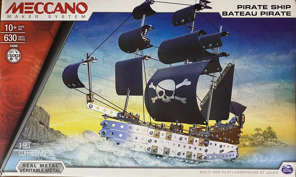 Brand new in the original factory sealed box. This Meccano Elite Pirate Ship Model Set is a must-have for any metal building set collector. Includes: 630 Parts, Stickers, 2 Real Tools, and 1 Instruction Sheet