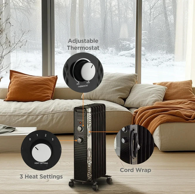 About this item Product details The New Mainstays Mechanical Oil Filled Electric Radiator Space Heater keeps you warm when the temperatures drop. It comes with four caster wheels for easy mobility, so you can move the heater from room-to-room. The heater is easy to use and features two control knobs - one for the thermostat, and one for the heat setting. With three heat settings (600, 900, and 1500 watts), you can maintain the perfect level of warmth. The space heater provides you with a comfortable, whole room heat without the noise of a fan. It's the perfect heater for day-to-day use while you work from home, practice your morning yoga, or relax in the living room. With safety features like auto shut off and tip over protection, you can rest easy and stay warm. Heat your home with the Mainstays Mechanical Oil Filled Electric Radiator Space Heater. Mainstays Mechanical Oil Filled Electric Radiator Space Heater, Black, New, WSH07O2ABB Three Heat Settings: Choose from 600W, 900W, or 1500W to perfectly match your heating requirements Easily Adjustable Temperature Settings: Two user-friendly knobs, one for temperature control and the other for selecting heat settings Enhanced Safety Features: Includes auto shut-off and tip-over protection for safe and worry-free operation Portable Design: Equipped with four caster wheels, allowing for effortless mobility and placement Power Indicator Light: Clearly shows when the heater is in operation Quiet Radiant Heat: Provides whole-room warmth without the disruptive humming noise typical of fan-based heaters Whole-Room Warmth: Efficiently heats entire rooms, ensuring consistent and comfortable warmth throughout Specifications Features Adjustable, Automatic Shutoff Brand Mainstays Power Type Corded Electric Recommended Location Indoor
