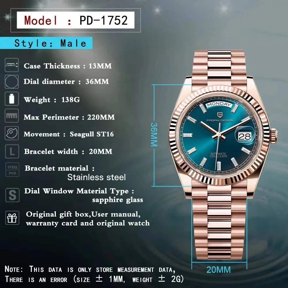 If available stock is too low, please advise the desired quantity. Product Highlights Swipe, compare and decide with confidence. 1 Overview 2 Gallery 3 Details & Specs 4 Support & FAQ Image gallery Tap thumbnails or arrows to switch the view. ‹ › ‹ › ‹ › ‹ › 1 / 4 2 / 4 3 / 4 4 / 4 Key benefits Why this product stands out Core features in a compact overview – ideal for quick comparison on eBay. Automatic Self-Wind Movement Powered by wrist motion; no battery required. Business-Ready Dial Roman numerals on a 35–1.54 in round dial with a folding clasp with safety. At a glance Quick summary Clear & concise Start each day with a precise, professional wristwatch that blends classic design with modern reliability. This mechanical watch uses an automatic self-wind movement powered by daily wear, so no battery is required. A round stainless steel case and matching band offer durable, business-ready styling, while a sapphire crystal guards a Roman numeral dial for clear readability. The timepiece is designed for everyday wear with a water-proof profile and a secure folding clasp with safety. Key dimensions and finishes support a balanced presence on the wrist: case thickness 0.45 in, dial diameter 35–1.54 in, and band width 20–0.94 in. The model PD-1752 features a stainless steel build and a round dial, delivered in a paper box with a manual and cleaning cloth for setup and care. A dependable option for daily business wear. Details & Specs Technical Specifications Mobile-friendly Mobile: stacked view. Desktop: table view. Movement Automatic self-wind Case Material Stainless steel Band Material Stainless steel Dial Window Material Sapphire crystal Display Type Roman numerals Case Diameter 1.42 in Case Thickness 0.45 in Band Length 22 Band Width 20-0.94 in Clasp Type Folding clasp with safety Movement Automatic self-wind Case Material Stainless steel Band Material Stainless steel Dial Window Material Sapphire crystal Display Type Roman numerals Case Diameter 1.42 in Case Thickness 0.45 in Band Length 22 Band Width 20-0.94 in Clasp Type Folding clasp with safety Service & help Our promise, support & FAQs What’s included, service promise and answers to common questions. Included Scope of delivery – what is in the box 1× Mechanical wristwatch 1× Packaging box 1× Manual 1× Cleaning cloth Instructions & Notes Set-up tips & usage hints Winding: If needed after a period of inactivity, gently wind the crown to start the movement. Time setting: pull the crown to the first position and rotate to set the hour and minute. Wear and care: regular wear keeps the movement wound; wipe the crystal with a soft cloth to maintain clarity. Water exposure: this watch is waterproof; avoid extreme temperatures and follow care guidelines to preserve the finish. Our Service Promise Shipping, delivery window & tracking Transparent fulfillment: We are your contractual seller on eBay. Many items are fulfilled through third-party partners. Dispatch origin can be China (most orders) or the United States (some orders). Handling time: Orders are typically processed within the handling time shown on eBay (commonly 3–4 business days), before they enter transit. Carrier/service may vary: The shipping service or carrier shown on eBay can differ from the actual carrier used. Shipments may involve multiple carriers (international line-haul and a different U.S. last-mile carrier). Delivery estimate: The delivery date shown by eBay is an estimate and can be affected by carrier operations, routing changes, peak season, weather, and customs/processing delays. We generally select suppliers targeting about 15 days or less, but delays may still occur. Tracking: Tracking is not uploaded for most orders. Only when it is needed to prove that it got delivered. Support & issue resolution: We aim to assist via eBay messages, but replies are not guaranteed and may be delayed. If there is any problem (not received, damaged, defective, or not as described), please use eBay’s official request/case flow (e.g., “Item not received” or a return request) so the issue is documented and handled under eBay policy. Frequently Asked Questions (FAQ) Answers to common buyer questions How does the automatic movement work? The watch winds itself from wrist movement. If not worn for a while, you can manually wind the crown a few turns to start it again. What materials and display features does it have? Stainless steel case and band, a sapphire crystal, and a dial with Roman numerals for easy reading. What are the size and clasp details? Case diameter 1.42 in, thickness 0.45 in; band length 8.66 in; band width 20–0.94 in; folding clasp with safety. How should I care for it and about water exposure? Wipe with a soft cloth and avoid strong magnets. Water resistance is not specified; avoid immersion unless rated. Have the movement serviced every few years. Structured product overview Designed for mobile & desktop Helpful support section © 2026 WARENGUT. All rights reserved. Item number: 5256808936861643