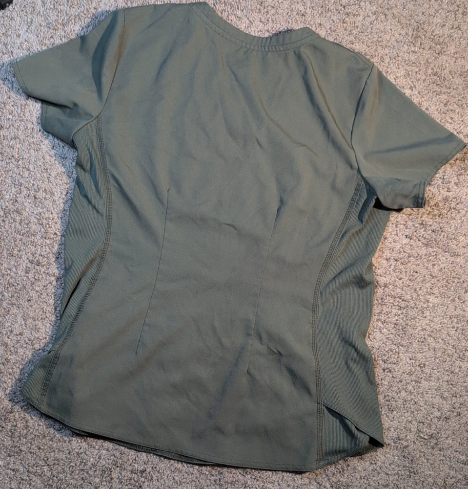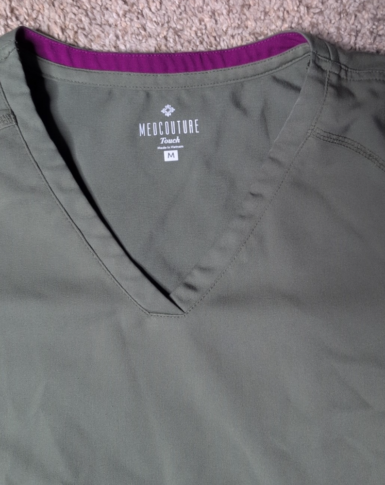 The Med Couture Touch Women's Scrub Top in size M offers a comfortable and stylish option for women in the medical industry. Made of polyester material, this solid green top features a V-neck design with added stretch for a flexible fit. Perfect for nursing and other medical professions, this scrub top by Med Couture provides a functional and professional look for female healthcare workers. Item is in good shape. It has a couple of stains that are faint. please see photos.