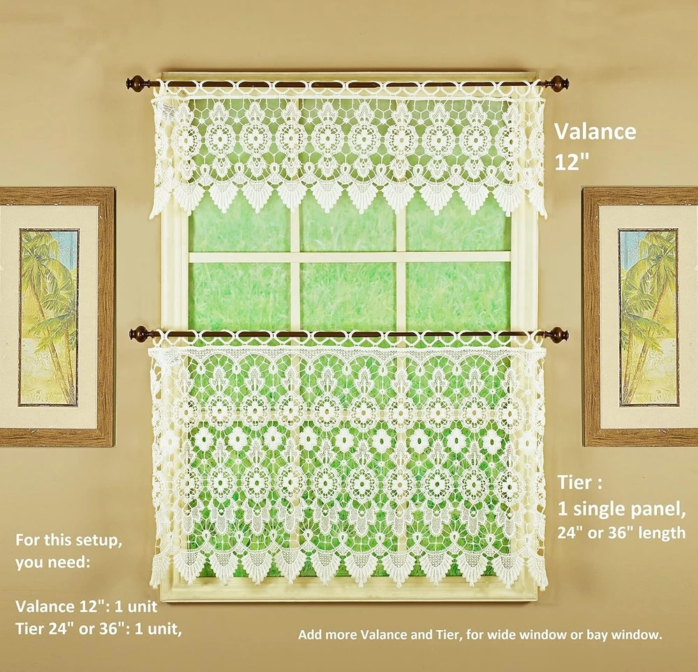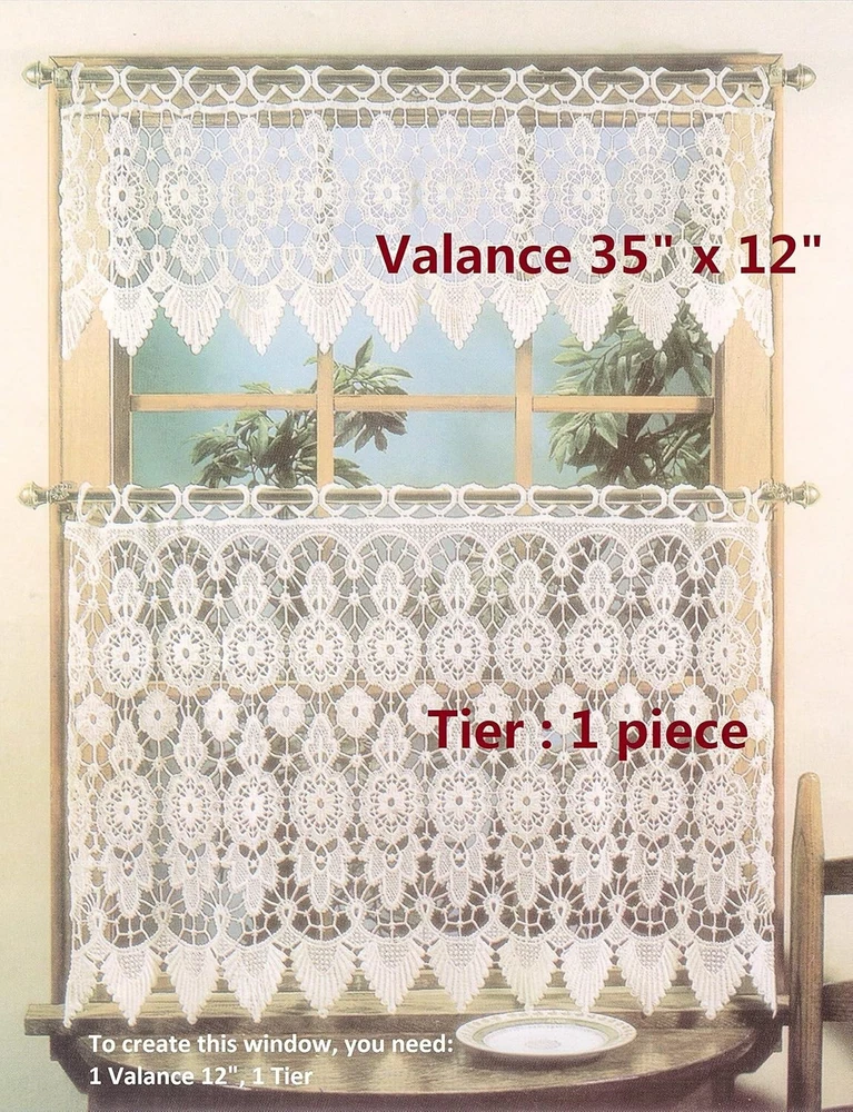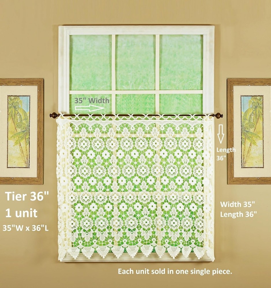 Today's Curtain Medallion Macramé Tier 36",Ecru,35W x 36L Brand Today's Curtain Color Ecru Material 55% combed cotton and 45% polyester, Polyester Product Dimensions 36"L x 35"W Opacity Light-filtering About this item Macramé Lace Majestic macramé lace all over curtain, entire one piece engineered and crafted loop top ready for decorative rods A true collection of classic décors that will surely last for many years blended 55% combed cotton and 45% polyester . We offer FREE shipping on all orders! . We ship within Five business days of payment, usually sooner. . We use a selection of shipping services such as UPS, FedEx, USPS etc. . We only ship to the lower 48 states, no APO/FPO addresses or PO Boxes allowed. . Local pickups and combined shipping options are not provided at this time. . Your satisfaction is a wonderful reward for our efforts. Please assist us by leaving a positive review if you feel pleased with our service. . In the event that you encounter any difficulties related to your order, please do not hesitate to reach out to us directly through the Messaging system on the Ebay platform. Kindly consider opening a COMPLAINT or a RETURN REQUEST as a last resort, only after all other possible measures have been attempted and we have been unable to provide you with assistance. . We will get in touch with you within 24 hours and make every effort to ensure your satisfaction. . Please rest assured of our service quality.