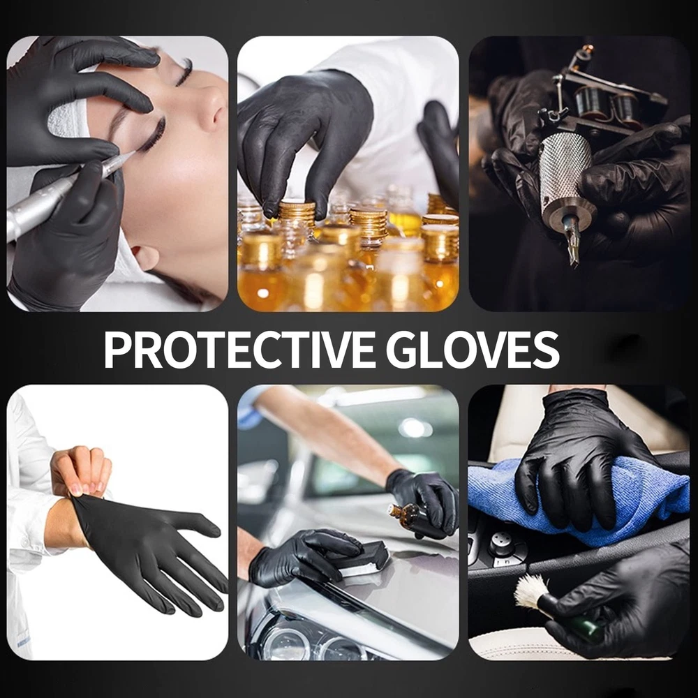 LATEX-FREE & POWDER-FREE: our nitrile gloves contain no natural rubber latex and are manufactured without powder - a safe solution for those affected by common glove allergies and sensitivities FEATURES: Black nitrile has a smooth finish for greater tactile feedback and is the right thickness for most uses - fingers are 0. 12mm thick and palms are 0. 08mm thick BULK QUANTITY: conveniently packaged to reduce storage space while ensuring a supply is always on hand - 100 disposable gloves per box and 10 boxes per case. 1000 pcs in total MULTIPLE USES: also great for use in a lab, kitchen, shop, or around the house - it protects, cleans, grips, and works as hard as you do