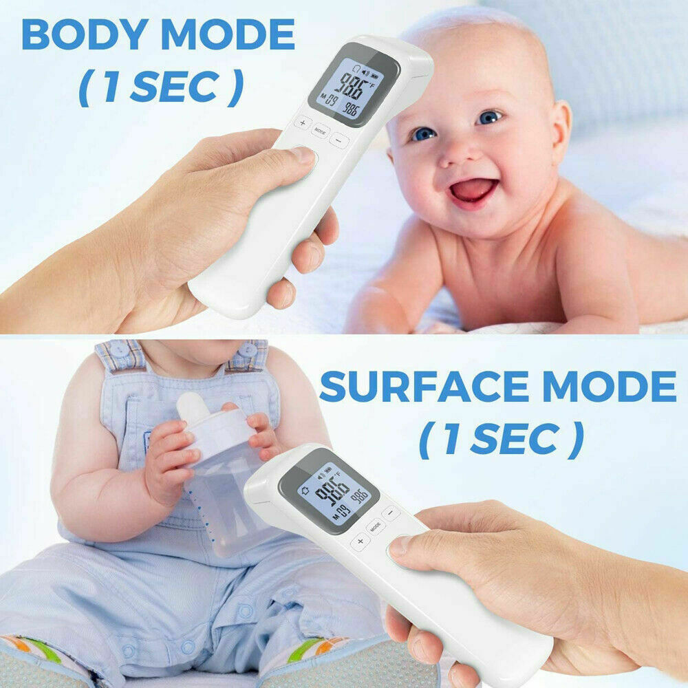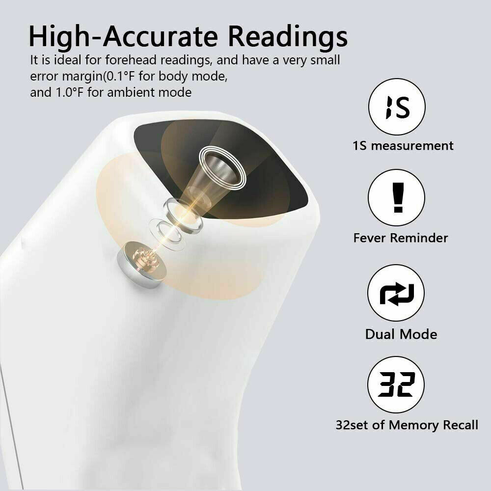 Product description Infrared Forehead Digital Thermometer, Temporal and Ear, Temperature Measurement for Adults Kids Infants and Baby, Accurate Instant Reading, Fever Alarm with Memory Function Product Features : Rapid temperature measurement: Simply point and activate, and within 1 second, results can be seen. 35 memory temperature readings Mute mode for readings for baby, infants, kids, and adults Temperature Alarm (default value is 100.4°F or 38°C) Measuring unit: Optional for Celsius ° / Fahrenheit ° Multi-function one key operation for body, object, forehead, and liquid temperature Automatic off function after 15 seconds Measuring Range: body mode: 93.2°F - 109.2°F or 34°C - 42.9°C Power by: 2 x AAA batteries (not included) Quick Start Guide °F/°C Switch: when the thermometer is on, press the "Mode" button about 2 seconds until F1 display , then press "+" / "-" button to switch between modes