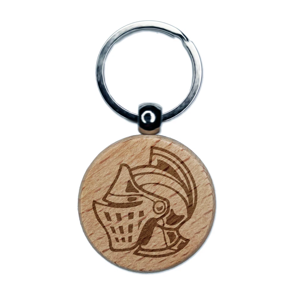 Medieval Knight Helmet Engraved Wood Round Keychain Tag Charm
