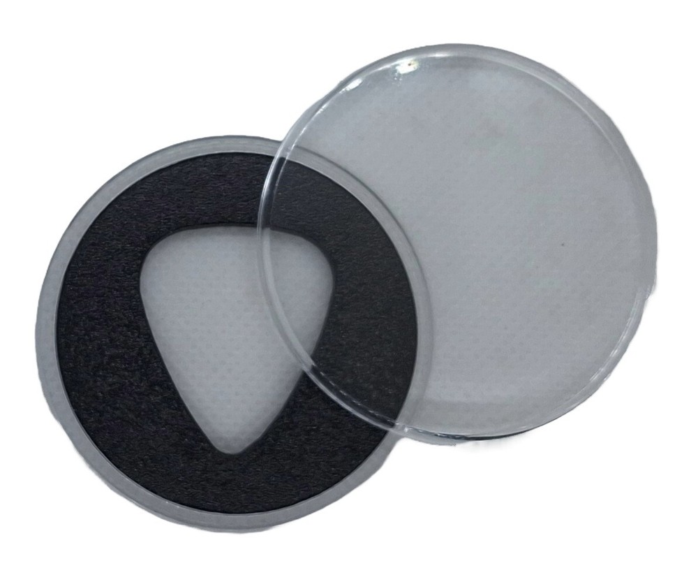 You asked for a larger guitar pick display. We listened and delivered. 100% Made In The U .S. A . One Guitar Pick Display Case with Stand (easel). The guitar pick is not included. Display stand (Easel) color: Black Foam Pick Holder Color: Black Fits 351 style guitar picks (both sides of the pick are visible) The diameter of the acrylic cover is approximately 2 inches (Medium Size). Easel Dimensions: 1 1/2"H x 1 1/4"W x 1 1/2"D Instructions: You will receive four pieces (acrylic base, foam, acrylic cover and easel). 1. Place the guitar pick (not included) into the guitar pick holder and then into the smaller acrylic piece. 2. Place the larger acrylic piece on top to act as a cover. 3. Place finished piece on the easel....and enjoy! Our holders are manufactured through the process of injection molding using virgin acrylic plastic that contains a non-yellowing agent, which helps maintain the clarity of the holders over time. The black material is produced from a cross linked polyethylene, which is a plastic material. The materials used in the production of our holders and rings are totally inert and PVC free. The holders are professionally die cut in the U.S.A. for a perfect uniform fit. Beware of imitators that cut their holders by hand using a knife or razor! The acrylic pieces can be re-opened if you want to take the pick out of the case. Shipping schedule is Monday - Friday. New York State residents add 8.75% tax. Visit our store!!!