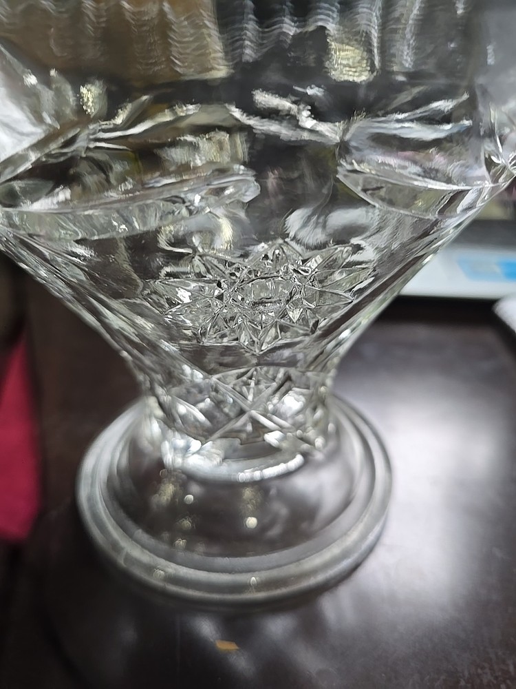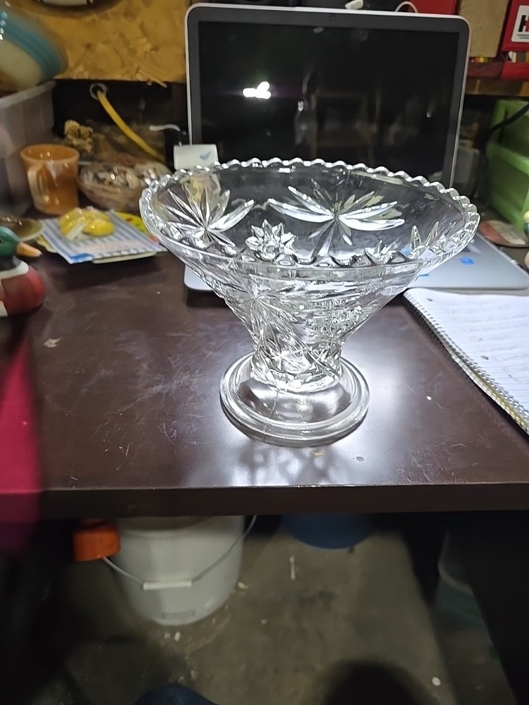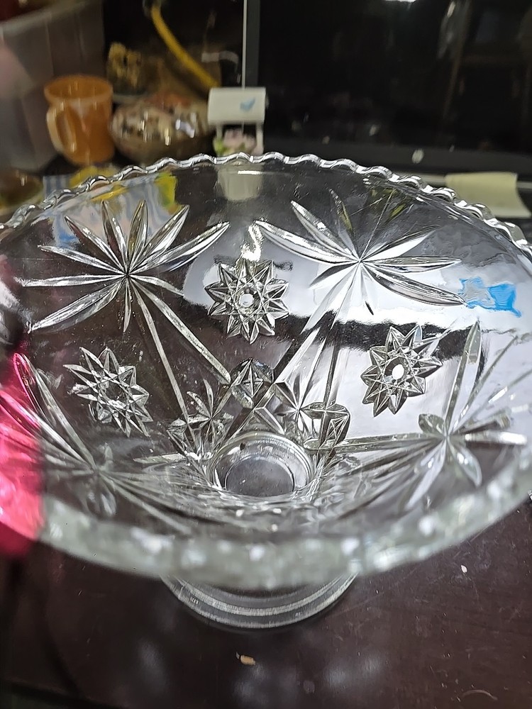 This is a vintage medium-sized glass punch bowl with an antique design, making it suitable for all occasions. The clear glass bowl is unmarked and measures approximately 6.5 inches in height and 8.5 inches in width, featuring a decorative pressed glass production style. This original piece from the United States is perfect for serving punch or other beverages at gatherings and events, adding a touch of vintage charm to the table.