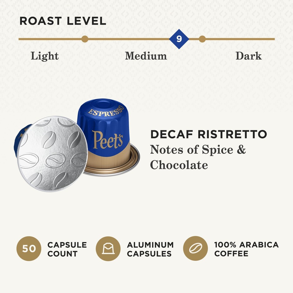 Contains five (5) Boxes of 10 Peet's Decaffeinato Ristretto - Intensity 9 Medium Roast Decaffeinated Coffee Single Cup Espresso (50 Espresso Total) Flavor and Roast: Decaf, Dark Roast - Intensity 9. Fragrant and nutty with a luxurious finish. 100% Arabica Coffee Peet's Espresso are with the Nespresso Original Machines*, Essenza Mini, Essenza Plus, Pixie, CitiZ, Lattissima, KitchenAid, and Creatista Nespresso Original machines.* Not with Nespresso Vertuo machines. *Peet's is not affiliated with the Nespresso brand. Recyclable: Peet's aluminum are recyclable through our -back program. Each aluminum capsule is sealed to preserve that delicious aroma and flavor for an intense espresso experience How to Brew: Peet's work with Ristretto (0.85 OZ / 25 ml) or Espresso (1.35 OZ / 40 ml) pulls on your brewer.