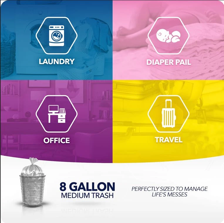 Trash Bags offer STRENGTH, STYLE, SAVINGS in every bag. 8 Gallon Medium Trash Bags are perfectly sized to fit your laundry room, office or kitchen trash receptacles. With a quick and easy twist tie closure, you can be sure your trash makes it to its final destination without falling out. Add in a subtle burst of Vanilla fragrance to keep your house smelling fresh and inviting. You can depend on 8 gallon 45 count Vanilla Twist Tie trash bags to be your reliable trash solution throughout your home. makes sense! Total rolls = 1 8 GALLON WASTE BAG: 8 packs of 45 count, ivory plastic, twist tie trash bags in Vanilla Flower scent TWIST TIE CLOSURE: The quick and easy twist tie closure secures the bag and makes for simple removal, keeping all trash inside IVORY WASTE BAG WITH A VANILLA FLOWER SCENT: Add a pop of color with our ivory liners. Make happiness a habit. Warm, comforting, familiar. GARBAGE CAN LINER: Ideal for collection of lightweight trash such as shredded paper, tissue and other light weight, non-sharp waste. Also great for cars and on-the-go travel MEDIUM GARBAGE BAGS: Perfectly sized for laundry and home office spaces. Also great for use in travel, wet clothing, packing material, and as a diaper pail liner.