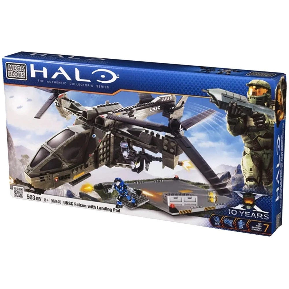 Mega Bloks [Halo] - UNSC Falcon with Landing Pad (96940) Condition: New The Mega Bloks [Halo] - UNSC Falcon with Landing Pad (96940) offers an immersive building experience for Halo fans and young builders alike. This action-packed set features the iconic UNSC Falcon, known as “The Warthog of the Skies,” complete with intricate details like rotating propellers and an opening cockpit. Perfect for recreating epic aerial missions, it provides endless opportunities for imaginative play and display. Included in this set are two detailed minifigures: a Silver UNSC Pilot to control the Falcon and a Mark V Air Assault Spartan, armed with a side-mounted M247H Heavy Machine Gun. Together, they are ready to take on Covenant forces, adding exciting battle scenarios to your Halo universe. The buildable landing pad further enhances the playability, serving as a realistic base for takeoffs and landings. Ideal for ages 8 and up, this set combines the thrill of building with the captivating world of Halo. Whether expanding your Mega Bloks collection or diving into the Halo storyline, the UNSC Falcon with Landing Pad offers hours of creative engagement and fun. Assemble your forces and soar into battle! Browse what else we have in stock - thousands of toys, games, and other fun merchandise from Poggers, the best toy store in the world!