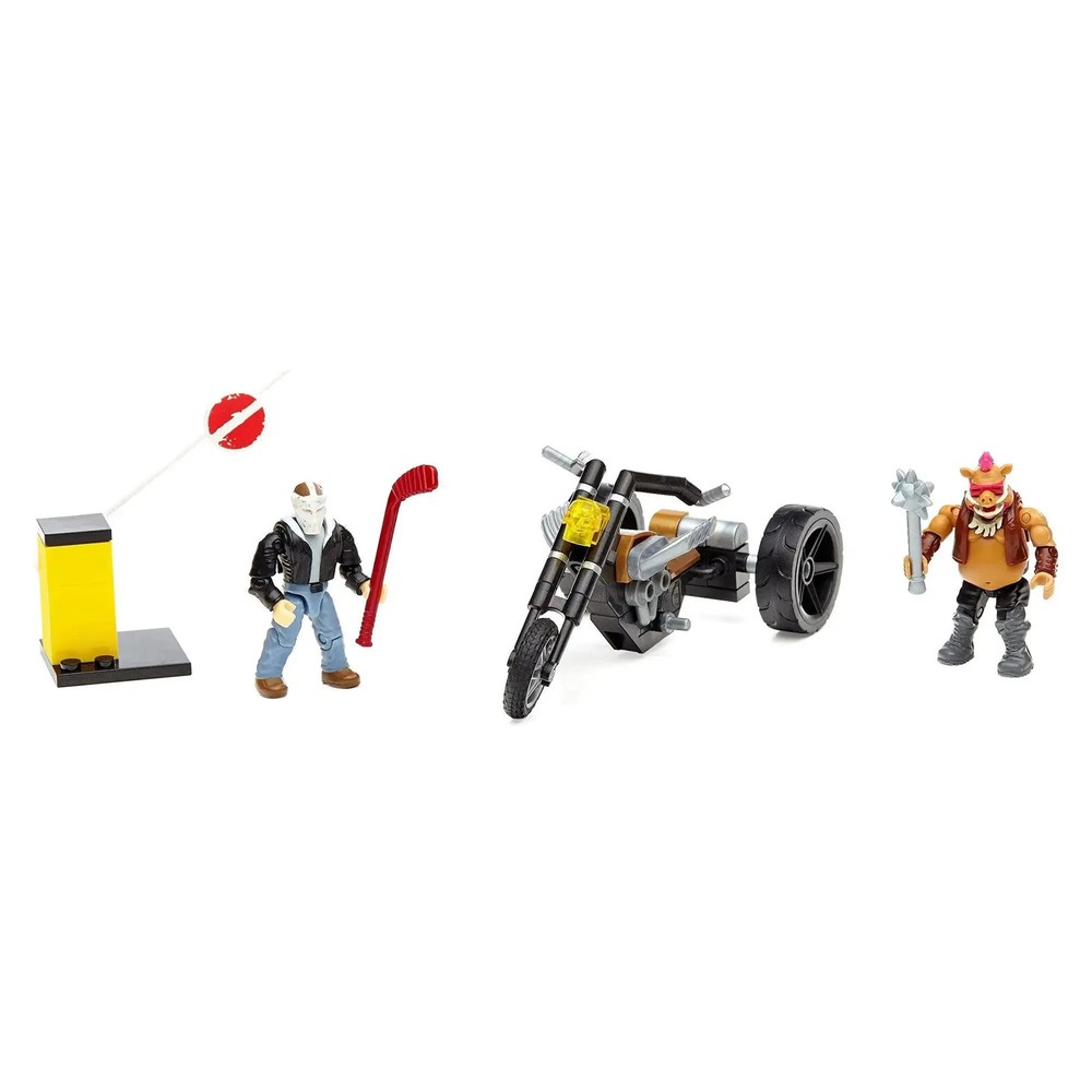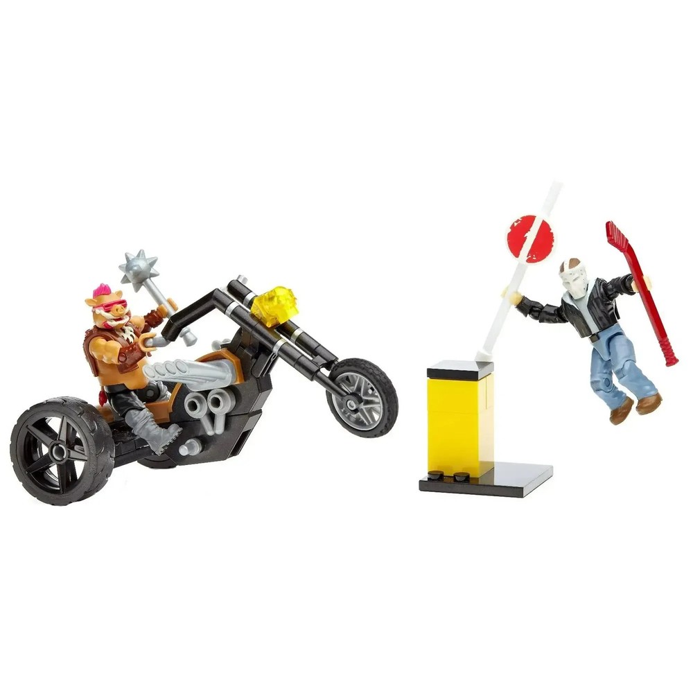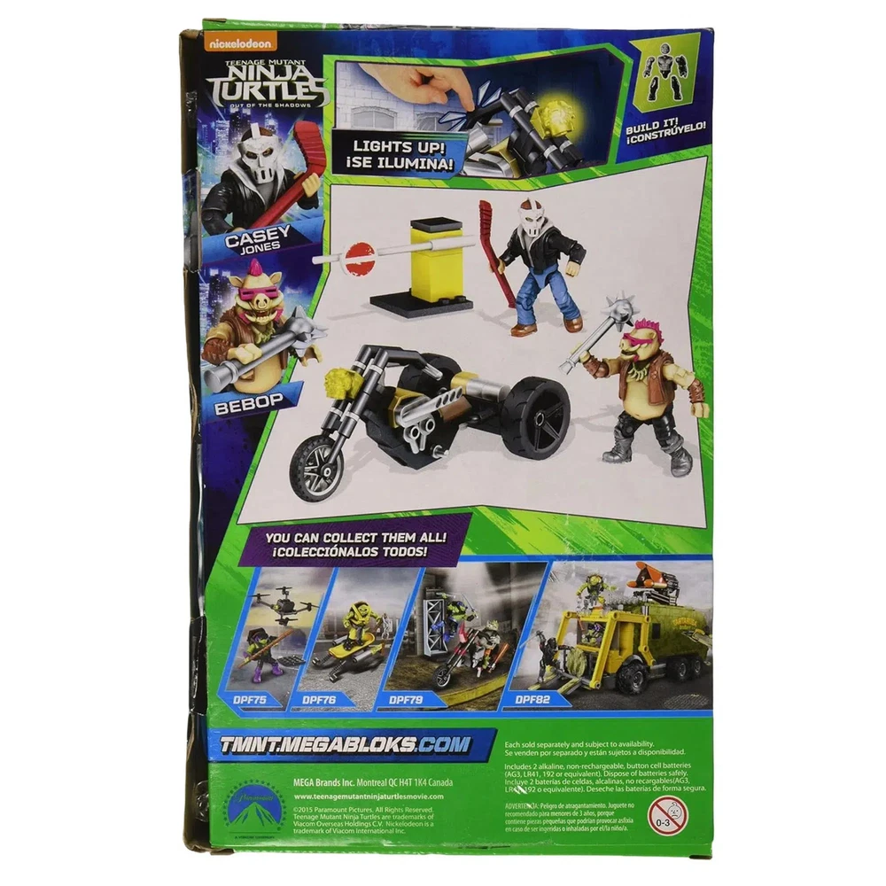 Mega Bloks [Teenage Mutant Ninja Turtles: Out of the Shadows] - BEBOP Moto Attack Building Set Condition: New Prepare for a high-octane showdown with the Mega Bloks [Teenage Mutant Ninja Turtles: Out of the Shadows] BEBOP Moto Attack Building Set. As Casey Jones prowls the streets, he suddenly finds himself face-to-face with the fearsome Bebop in a thrilling chase. Rev up the excitement by building Bebop’s motorcycle, complete with rolling wheels and shell-themed LED lights activated by a shock sensor, ready to hunt down the masked vigilante. The set features a buildable parking tower with a spinning stop barrier, setting the stage for an epic crash as Casey lures Bebop into a trap. Watch as Bebop smashes through the barrier in a spectacular clash of strength and strategy. This set includes two highly articulated micro action figures: Casey Jones, armed with his signature hockey stick, and Bebop, wielding a menacing mace. Connect this set with other Mega Bloks [Teenage Mutant Ninja Turtles: Out of the Shadows] sets to create your own movie-inspired brawls and relive the explosive action of the film. Browse what else we have in stock - thousands of toys, games, and other fun merchandise from Poggers, the best toy store in the world!