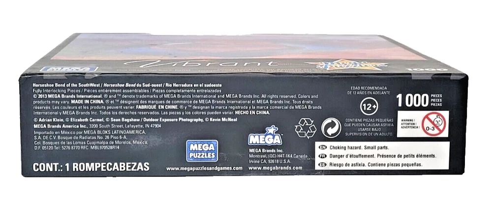 This Mega Puzzlers Vibrant 1000 pc Jigsaw Puzzle features the breathtaking Horseshoe Bend of the Southwest, in Glen Canyon, Arizona. The puzzle pieces are made of high-quality cardboard material and come in a multi-color design, making it a perfect addition to any puzzle collection. The puzzle is suitable for ages 12 and up and was manufactured in China in 2013 by the brand Mega Puzzlers. It is sure to provide hours of entertainment and relaxation. Order now to add this beautiful Grand Canyon-themed puzzle to your collection! We did not work the puzzle or count the pieces, but we verify the number count at your request . Each item we ship is carefully packaged to prevent any damage and is shipped immediately with tracking.