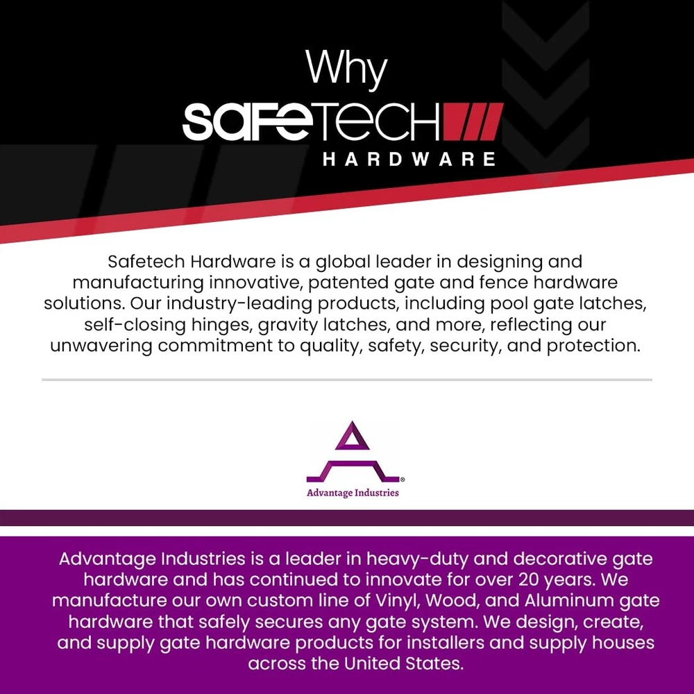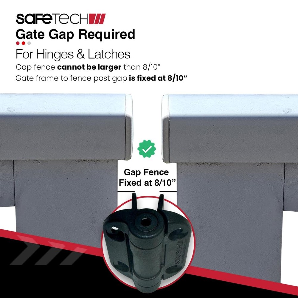 have designed a reliable, durable, trustworthy, and cutting-edge hardware solution for high traffic areas. Our gate hinges can be adjusted horizontally and vertically for easy alignment. SELF CLOSING GATE HINGE: Safetech self closing pool gate hinges are the only spring gate hinges on the market to feature our patented tension adjustment system. Our fence gate hinges are protected, made to last, and designed to protect your loved ones by safeguarding your swimming pool, garden, and perimeter gates. The cost to value ratio is better than any other similar product. HORIZONTALLY & VERTICALLY ADJUSTABLE SPRING GATE HINGE: As the tension changes, the system makes a clicking sound that lets you monitor just how much you’ve adjusted the spring loaded gate hinge. The tension variable system makes Safetech Gate Hinges easy to install, so you can get the job finished in record time. Our gate hinges offer vertical and horizontal adjustment to ensure precise alignment and reliable operation. FEATURES: ● Self-closing gate hinges ● Self-closes gates up to 187lbs. ● Tension adjustment system ● Rust & corrosion proof ● Perfect for Square Post Gates ● Self closing Tension Gate Hinges ● Made for Garden Gates, Pool Fences and high traffic areas SELF-CLOSING ADJUSTMENT FOR ALL TYPES OF FENCING: The adjustment is according to closing speed, gate weight, and the resulting momentum generated by gate movement. The heavy gate hinges can be easily installed and used with all types of fencing including aluminum and metal fencing. Our heavy duty gate hinges provide double-face fixing strength and are the safest investment you can make when it comes to hardware. If you are looking for face mount gate hinges of heavy-duty nature, you have come to the right place. PRODUCT DIMENSIONS: Weight: 1.5lbs Size: 6 x 4 x 3 inches 𝗔𝗱𝗷𝘂𝘀𝘁𝗮𝗯𝗹𝗲 𝗧𝗲𝗻𝘀𝗶𝗼𝗻 𝗦𝗽𝗿𝗶𝗻𝗴𝘀: Our patented tension adjustment system allows you to customize the closing speed using the included Allen-key. Precisely align the self-closing hinges and latch posts for smooth gate operation and secure latching. 𝗣𝗼𝗼𝗹 & 𝗖𝗵𝗶𝗹𝗱 𝗦𝗮𝗳𝗲𝘁𝘆: Safetech self-closing fence gate hinges are designed to ensure gates are never accidentally left open, making them ideal for swimming pools, childcare centers, schools, playgrounds, and homes. 𝗙𝗲𝗻𝗰𝗲/ 𝗚𝗮𝘁𝗲 𝗧𝘆𝗽𝗲: Our heavy-duty gate hinge is made for use on aluminum gates weighing up to 800 pounds max load per pair and swing close efficiency at 185 pounds and usable with an 8/10” gate frame to fence post gap. 𝙣𝙤𝙩 𝙨𝙪𝙞𝙩𝙖𝙗𝙡𝙚 𝙛𝙤𝙧 𝙘𝙝𝙖𝙞𝙣 𝙡𝙞𝙣𝙠 𝙛𝙚𝙣𝙘𝙚. 𝗘𝗮𝘀𝘆 𝗜𝗻𝘀𝘁𝗮𝗹𝗹𝗮𝘁𝗶𝗼𝗻: Our SHH-135 Megaklik kit includes two hinges, Allen-key, installation guide, and fasteners. Review our installation video for more information. 𝗛𝗲𝗮𝘃𝘆 𝗗𝘂𝘁𝘆 𝗣𝗼𝗹𝘆𝗺𝗲𝗿: Our polymer hinges will not rust, bind, sag or stain. Along with its self-lubricating feature, our hinges require no maintenance throughout their life and apply lubrication on every use. 𝗚𝗮𝘁𝗲 & 𝗙𝗲𝗻𝗰𝗲 𝗛𝗮𝗿𝗱𝘄𝗮𝗿𝗲 𝗦𝗼𝗹𝘂𝘁𝗶𝗼𝗻𝘀: is a global leader in innovative, patented gate and fence hardware, specializing in high-quality, secure, and reliable products like pool gate latches, lockable gravity latches, and self-closing hinges. Designed for ease of use and installation, our solutions empower manufacturers and installers worldwide with cutting-edge hardware.