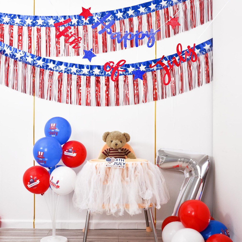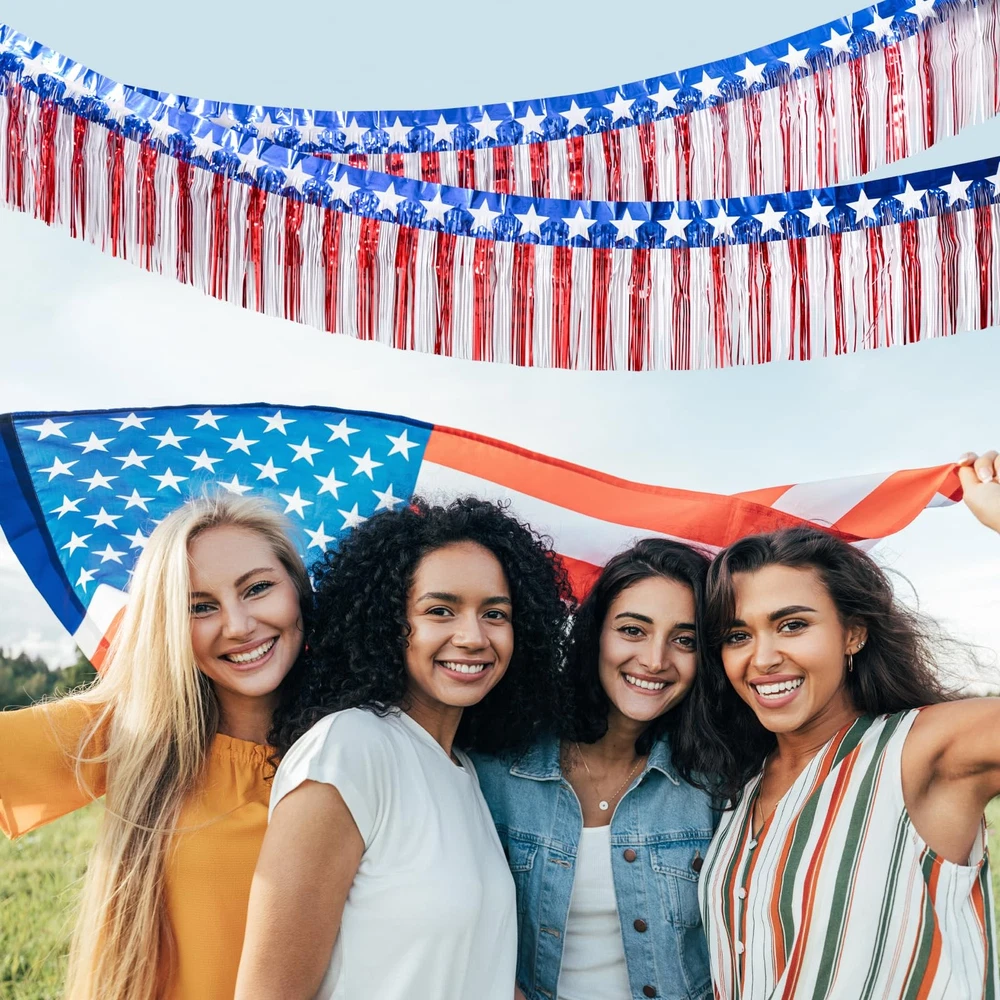Mega-L 4th of July 2 Pack Ceiling Tinsel Fringe 🗽 PACKAGE INCLUDES: 2 Packs red white and blue star foil fringe garland / metallic tassel banner, each garland is 1.24 feet wide * 19.68 feet long, perfect 4th of July decorations. 🎆 EASY TO INSTALL: Metallic foil fringe garland has double stick tape at the back for easy mounting and removal. It can be easily cut into any size as well. 🇺🇸 HIGH-QUALITY FUNCTION: High-quality metal foil tassel garland, lightweight, easy to use, bright color, can create a strong festive and fun atmosphere. 🦅 APPLICABLE OCCASIONS: Suitable for all kinds of activities, such as parade floats, table skirts, weddings, carnivals, graduation parties, classroom decorations, stage skirting, Christmas, Halloween, dance, photography background, etc. 🌎 FESTIVE AND FUN: These 4th of July foil streamers are the finishing touch for any themed party such as Memorial Day Party, US Flag Day, Independence Day party, Veterans Day party, Election party, Labor Day party, or wedding party decorations.