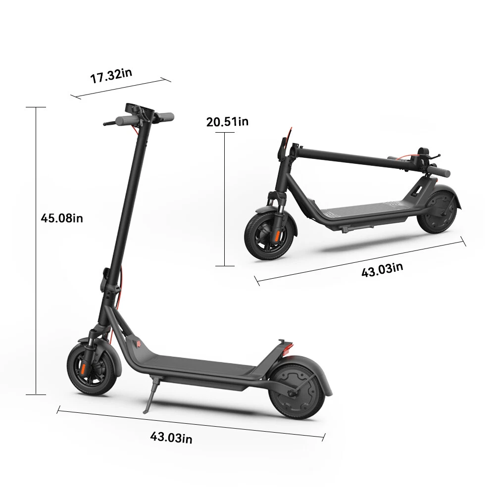 Features: Powerful Motor & Long Battery Life: The electric scooter is equipped with a peak 300W motor. The high-powered motor can easily navigate 10% slopes and is equipped with a 164Wh high-capacity lithium battery with a range of 13 miles, making it ideal for short-distance commuting and trips Safe & Comfortable Riding: This electric scooter adults is equipped with Electronic Brake and Drum Brake. Bright headlight and bell ensure safe riding at night.To ride safely, the electric scooter is equipped with a non-zero start function to ensure safe starting 3 Speed Modes & LED Digital Display: In order to meet the different needs of use from teens to adults, the electric scooter is equipped with 3 speed gears: low speed (3 mph), medium speed (9 mph) and high speed (15 mph). Riders can see real-time speed, speed mode, battery life and light icon with LED display Lightweight & Foldable Design: The adult electric scooter is equipped with one step folding system, and the weight of the electric scooter is only 32.85lbs, which is convenient for you to carry it up and down stairs or into the subway station. Also, it can be placed in the trunk of the car or any compact space. The folded size is 43.03"x17.32"x20.51" SMART APP CONTROL: Lets you lock and unlock these folding electric scooters for adults and monitor their riding status using the Tuya app. Enhanced Safety Features: Safety is a top priority with the A1C electric scooter. It comes with ultra-bright headlights, taillights, and a bell to enhance visibility and alert others to your presence, especially during nighttime rides. The scooter also features sensitive Electronic Brake and Drum Brake, providing reliable stopping power and reducing the risk of accidents. It is UL 2272 Certified. Warm Tips - The speed and range of electric scooters vary depending on weight, surface, temperature, battery and riding style. If you have any questions, please contact us Specification: Brand: Megawheels Model: A1C Dimension: Unfolding 43.03×17.32×45.08 in; Folding: 43.03×17.32×20.51 in Net Weight: 32.85lb Color: Black Tires: 8.5" Front & Rear Solid Tire Max Load: 100kg Max speed: approx.25KM/h Speed level: Gear 1--Max 3 MPH ; Gear 2--Max 9 MPH; Gear 3--Max 15 MPH Mileage: Approx. 13 miles Grade Ability: 10% Working Temperature: -10°C to 45 °C Storage Temperature: -20°C to 25°C Battery Capacitiy: 7.5 Ah Rated Power: 300W Charger Input Voltage: 100V-240V Charger Frequent: 50Hz/60Hz Charging time: approx. 5.5 hours Package : 1 * Electric Scooter 1 * Battery Charger 1 * User's Manual Note: This products have been certified under UL2272 safety standards.