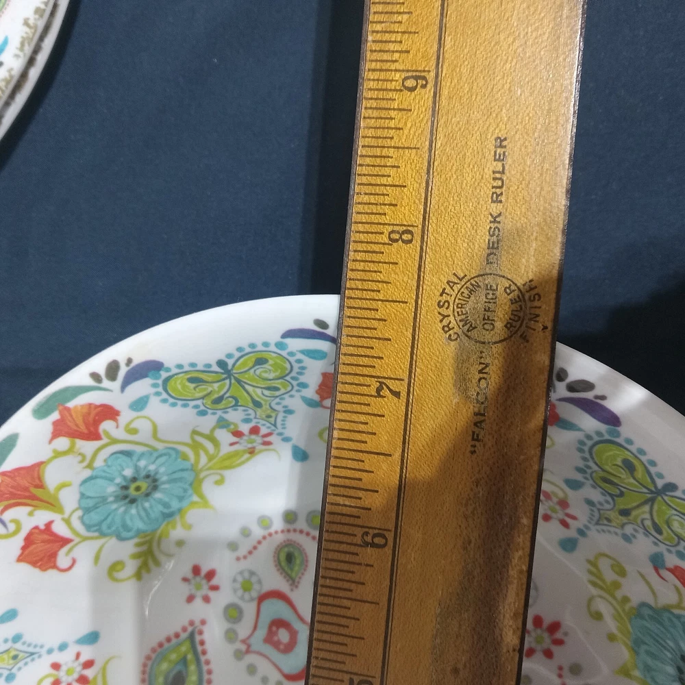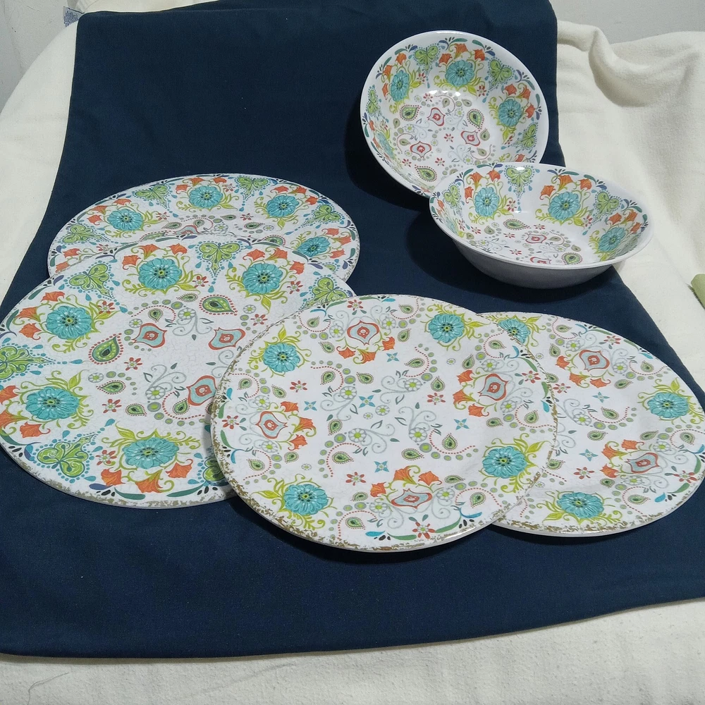 Melamine ware, service for 2. Dinner plates, sandwich or dessert plates, salad or soup bowls; 2 each. Please see photos as they are part of the description. Great condition!!