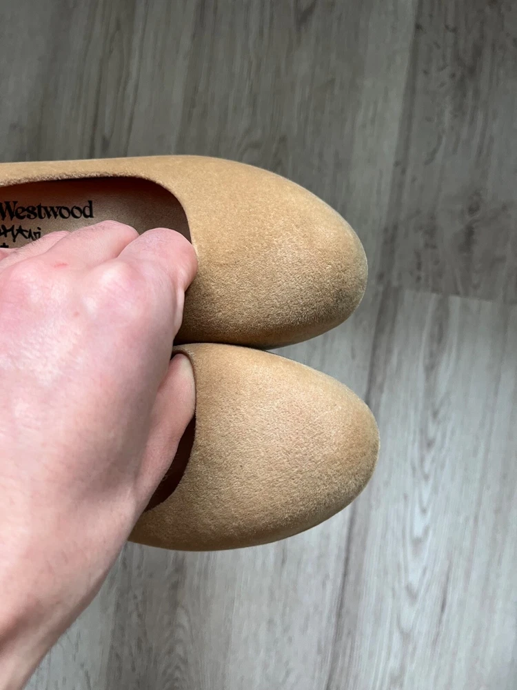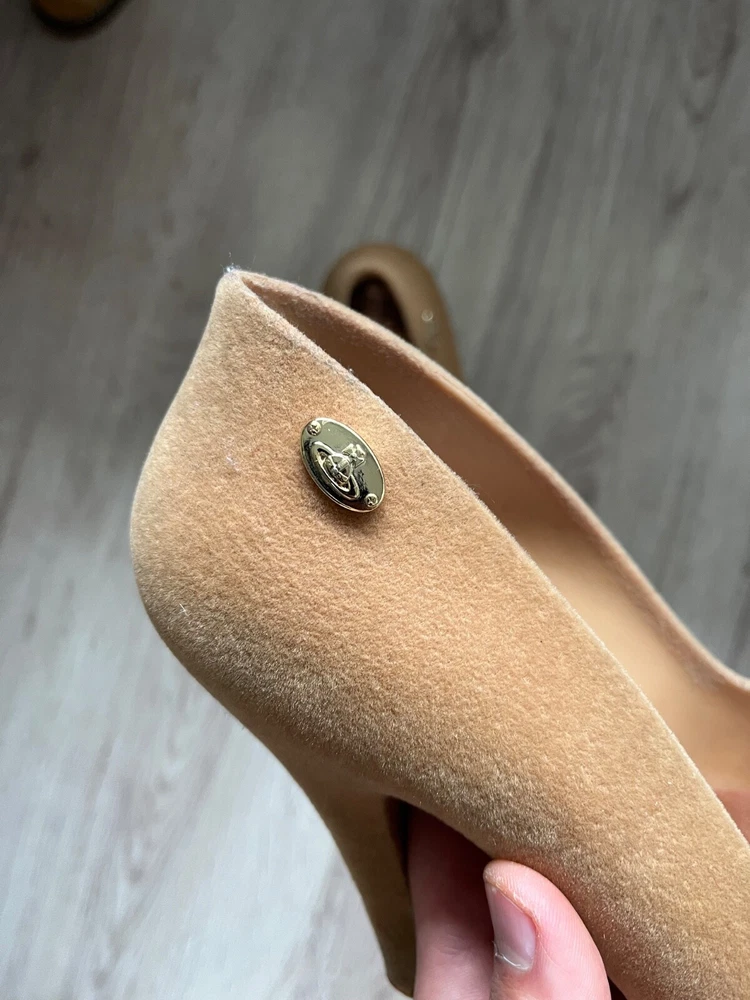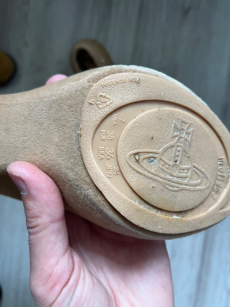 Elevate your shoe game with these stunning Vivienne Westwood flats. The melissa velvet effect rubber shoes in a beautiful beige color are perfect for any occasion. These women's shoes are made with high-quality materials and are designed to provide comfort and style. The shoes are a US size 7 and are perfect for those who love flats. Add these shoes to your collection today and step out in style.