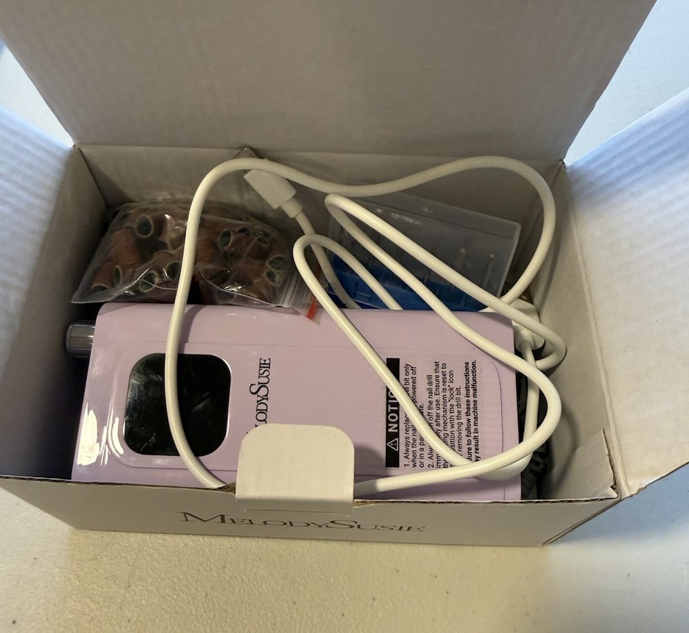 MelodySusie Professional Cordless Rechargeable Nail Drill Model SC300F. Has been gently used. There is minor scuff marks on the purple base and on the black screen as seen in picture, but does not affect performance whatsoever includes drillbit set drill bit covers rechargeable cord.