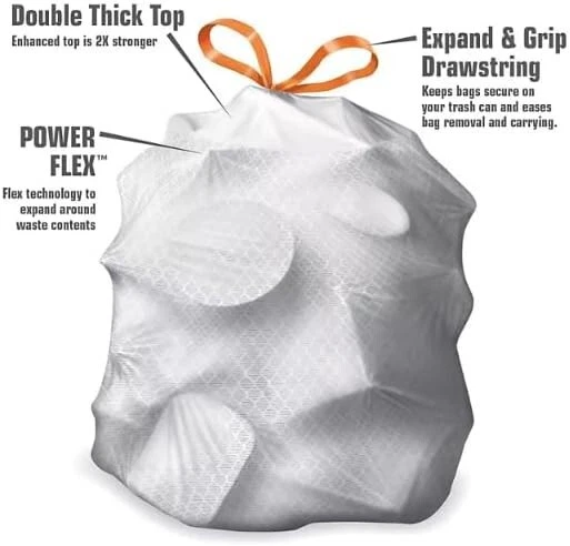About this item Member's Mark 13 gallon Tall Kitchen Bags New Longer Bag, 200Count(Pack of 2) Capacity 13 Gallons Unit Count 400.0 Count Recommended Uses For Product Kitchen Waste Material Linear Low Density Polyethylene, High Density Polyethylene Item Form Bag Scent Fresh Number of Items 2 Item Weight 8.8 Pounds The information below is per-pack only Fresh scent beats trash odors Product Description Member's Mark Power flex tall kitchen bags will revolutionize the way you think about trash bags. Feature-rich, these bags deliver quality and Strength in all of the important areas. The patent-pending, double-thick top multiplies the strength of the top five inches of the bag, providing an extra measure of security and preventing finger punctures during bag removal. The power flex Technology enhances the bag's exceptional qualities and flexes to expand around contents. The innovative seals along the sides of the bag protect from leakage. And, the elastic drawstring expands to keep the bag tight on your trash can and is designed to make carrying to the curb worry-free. This 13-gallon bag fits most kitchen cans and is convenient for home office use. Plus the fresh clean scent neutralizes odors to keep your kitchen smelling fresh always!