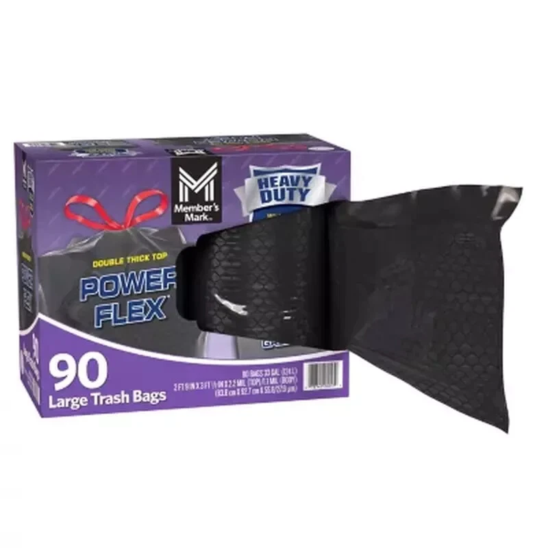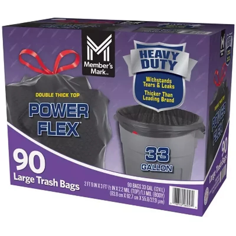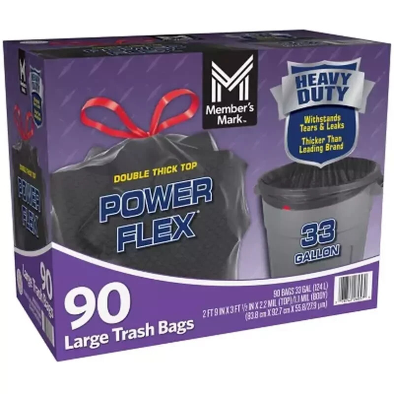 Member's Mark 33-Gallon Power Flex Drawstring Trash Bags ( 90 ct. ) FREE SHIP Description : Member's Mark Trash Bags Specifics These ultra-durable trash bags have a 33-Gallon capacity and are stronger and durable. Each bag in this pack of 90 has leak protection seals that prevent seepage of wet items when moving bags from the job site to the curb. They are also designed to be tear resistant, which is especially important when removing heavy objects or sharp items, like branches from the yard. The double thick top and drawstrings make closing and sealing the bags easier than ever. Who Needs These Garbage Bags? These trash bags are perfect for when tricky household tasks arise, like when you're moving, doing yardwork, cleaning the attic or emptying out the basement. They are also great for businesses that engage in outdoor work, like landscaping and construction, as these large trash bags are thick and strong enough to help haul away dirt, debris, concrete blocks, bricks, rubble and dead plants and bushes. These thick trash bags ensure the garbage stays in and never breaks free, which prevents an annoying mess that needs to be cleaned. Features : Gallon capacity: 33 Double thick top Leak & tear resistant Size: 33" x 36.5" Color: Black Quantity: 90 bags Convenient and easy to use Easy One-by-One dispensing We try our very best to make sure every customer is completely satisfied. If there's a problem, message us! We're happy to help Visit Our store to get great Discounts ,looking forward for your positive response !