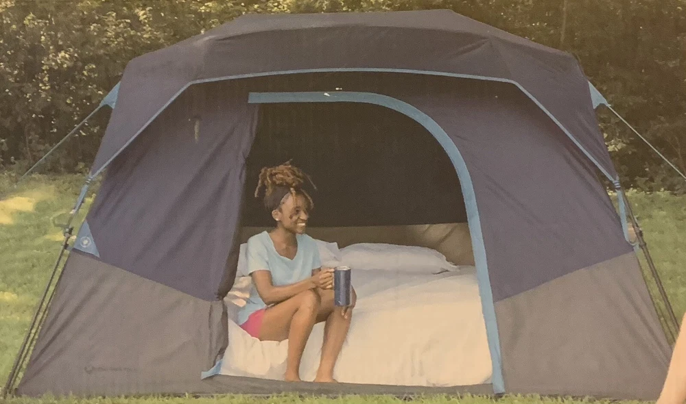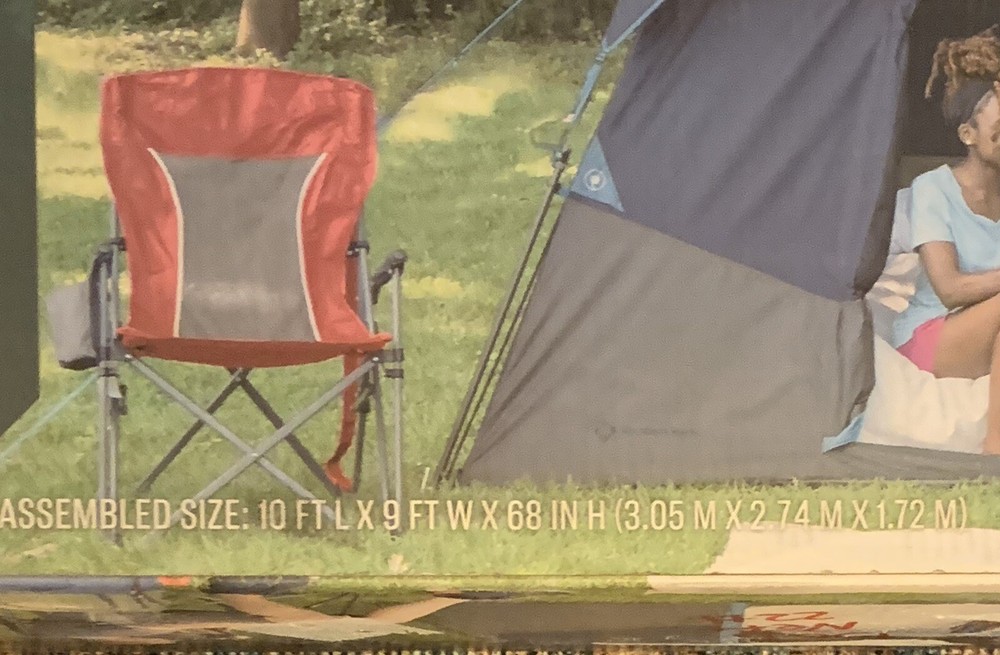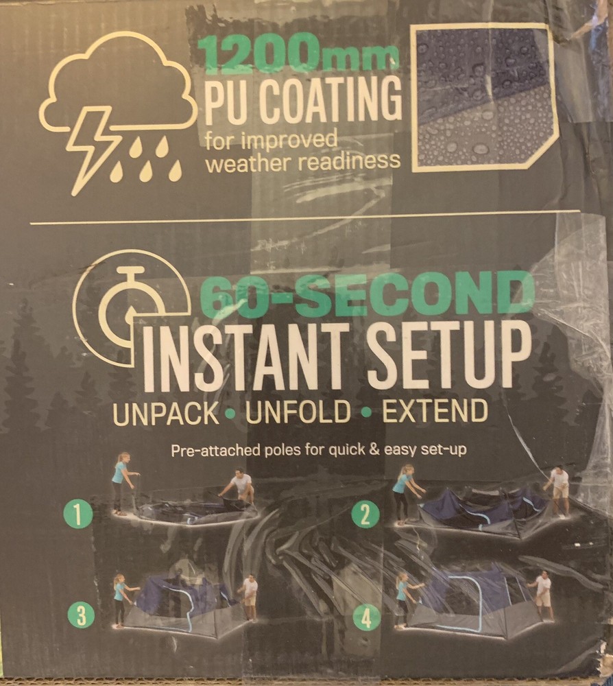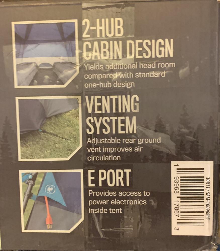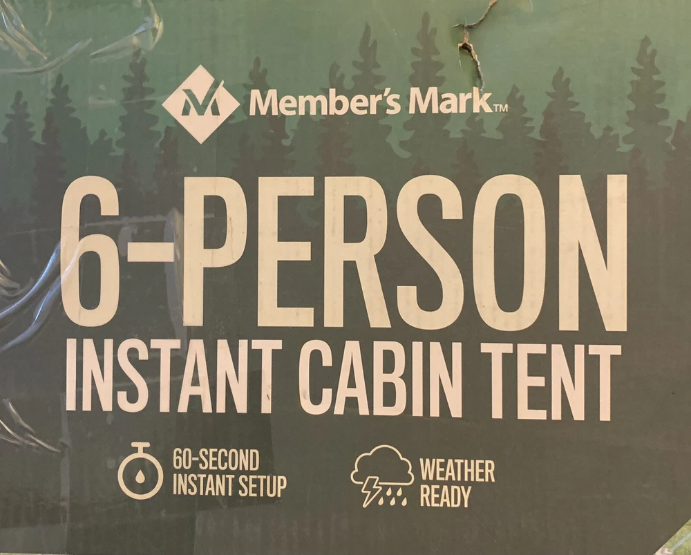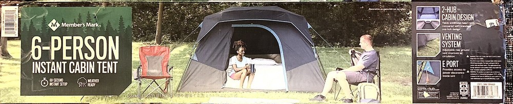 Introducing the Members Mark 60 Second Set Up 6 Person Tent in Navy/Gray. This spacious cabin tent has a square shape with a large size of 10'X9'X5'-8" and can accommodate up to 6 persons. The tent is designed with a 2 port cabin and venting system, allowing for proper air circulation during hot weather conditions. The tent is made of high-quality materials that make it sturdy, durable, and perfect for general use during any season. It features an E port for easy electrical cord access and has one door for easy entry and exit. With a weight of 15 lb and a quick set up time of 60 seconds, this tent is perfect for a hassle-free camping experience. Box is scoffed on edges from shipping, but tent is not damaged.