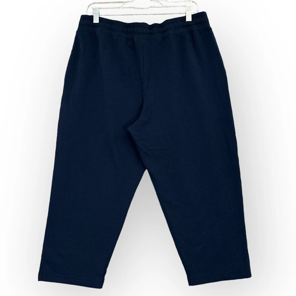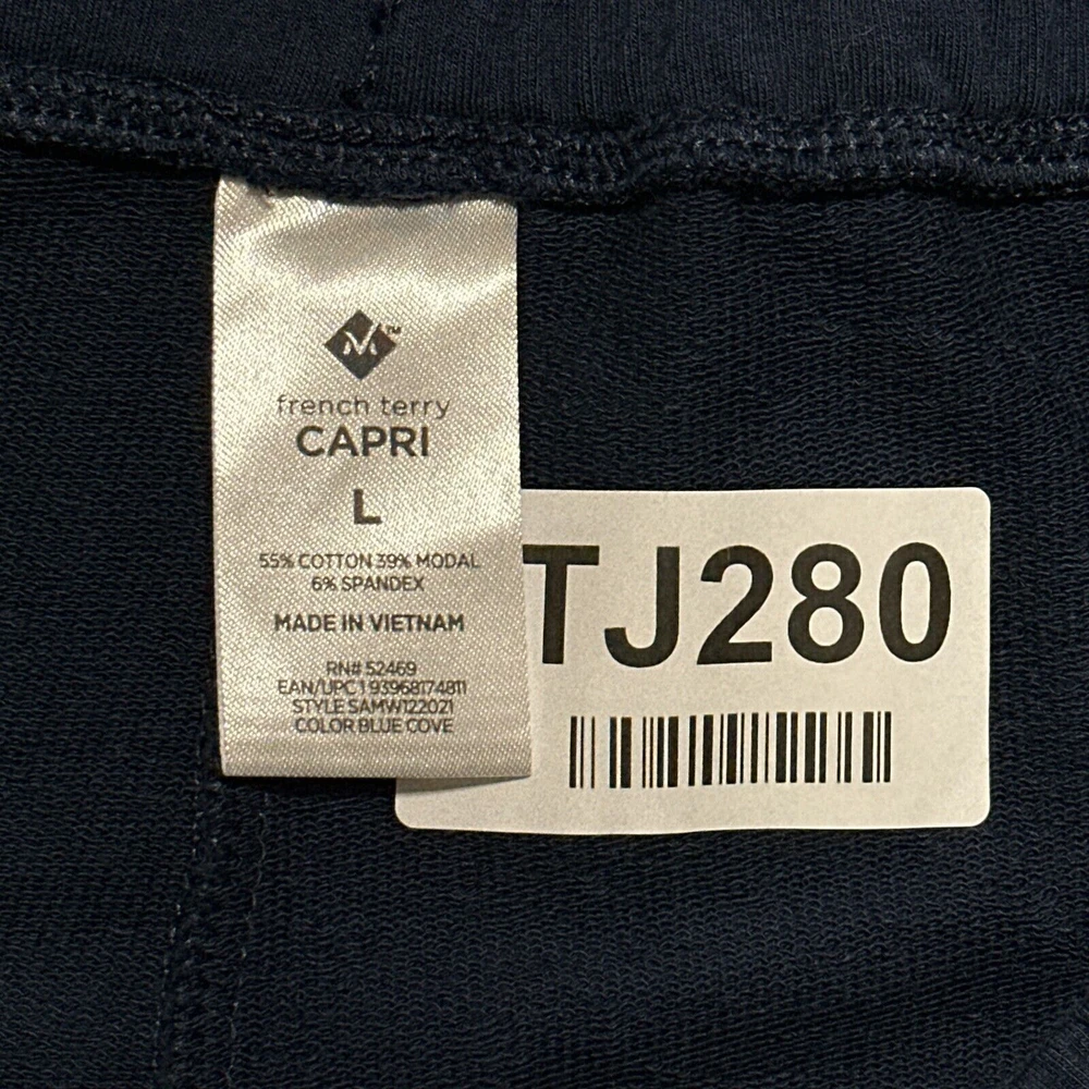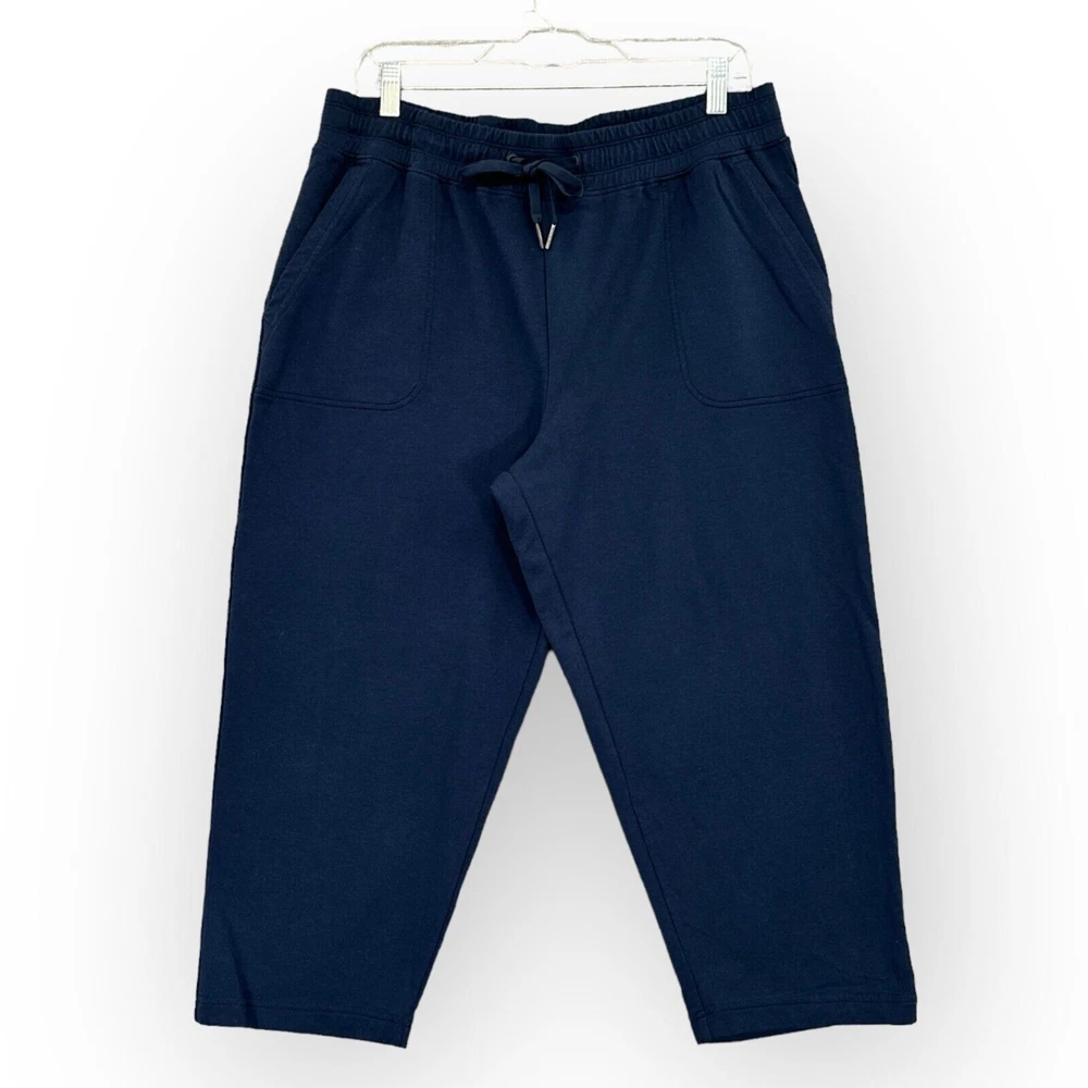 Material: Cotton, Modal, Spandex, spa Fit: Relaxed Inseam: 21.5 in Rise: High (Greater than 10.5 in) Pattern: Solid Waist Size: 32 in Size: L Style: Capri Type: Pants Seller Notes: “Good Pre-owned Condition. Please see photos for details.” Color: Blue Fabric Type: French Terry Features: Stretch Size Type: Regular Garment Care: Machine Washable Department: Women Closure: Pull On Brand: Member's Mark