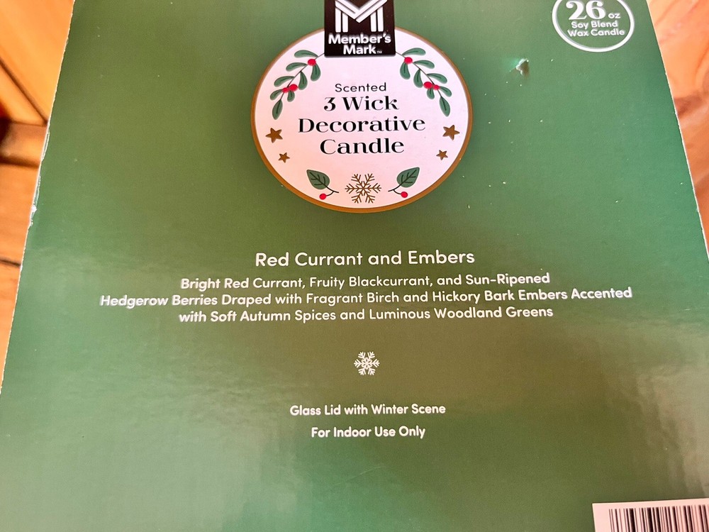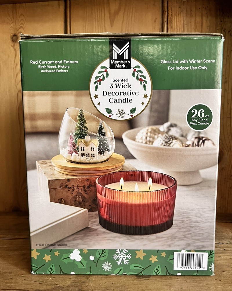 New Members Mark Christmas Snow Globe Scented 26 ounce Soy Wax Blend Candle. RED Currant & Embers candle is scented with a blend of bright red currant, fruity blackcurrant, and sun-ripened hedgerow berries, draped with fragrant birch and hickory bark embers. It is accented with soft autumn spices and luminous woodland greens. 5ai2