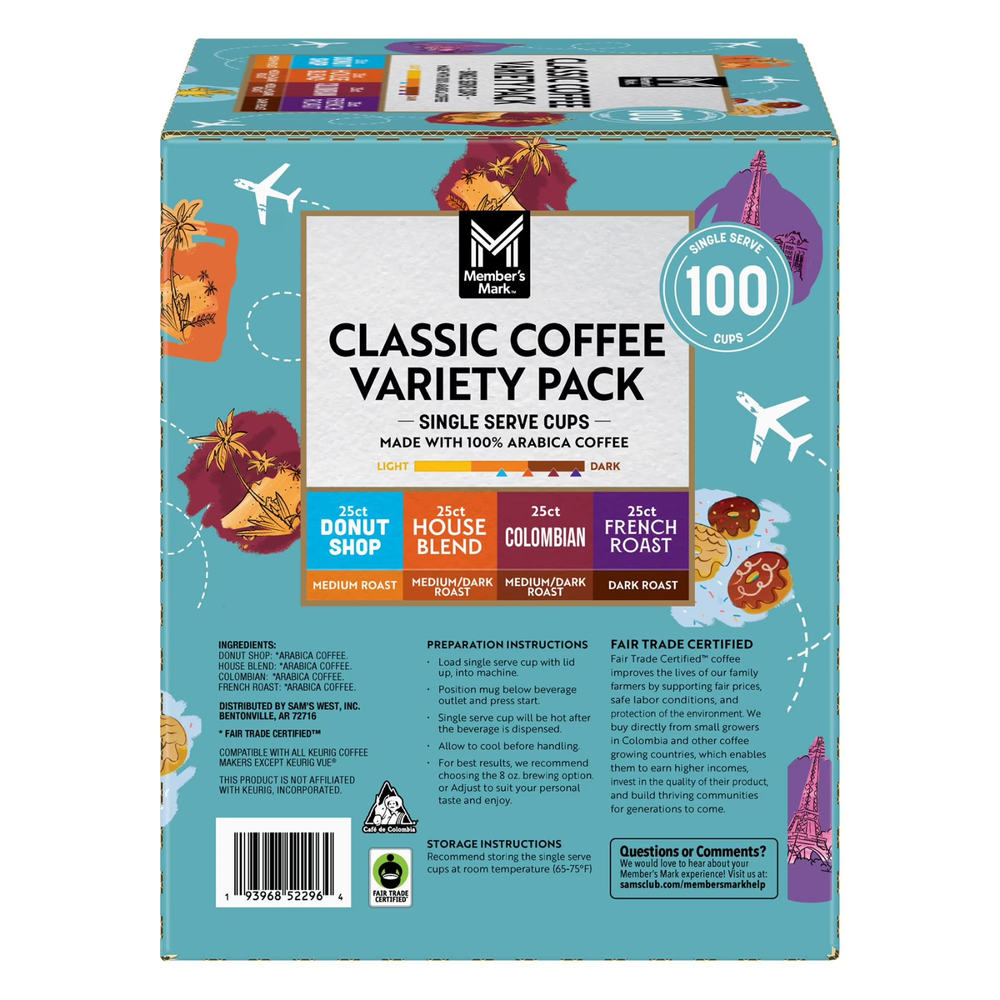 Member's Mark Classic Coffee Pods, Variety Pack, 100 ct. About this item Product details Experience Classic Coffeehouse Flavors at Home Bring the charm of a coffeehouse to your kitchen with this classic collection. Perfect for busy mornings, relaxed weekend brunches, or those moments when you want to indulge in something special, this assortment is crafted to elevate your coffee experience. Delightful Assortment of Flavors Discover a variety of rich and satisfying flavors: Member's Mark™ French Roast: Bold and full-bodied with notes of dark chocolate, roasted nuts, and a hint of caramelized sugar. Member's Mark™ House Blend: Smooth and balanced, featuring toasted nuts, mild cocoa, and a touch of vanilla. Member's Mark™ Donut Shop: Flavorful and well-balanced with caramel, browned sugar, and a hint of sweet citrus. Member's Mark™ Fair Trade Organic Dark Roast: Rich and robust with dark chocolate, spicy-sweet baking spices, and bittersweet cocoa notes. Perfect for Any Occasion Whether you're hosting friends, enjoying family gatherings, or savoring a quiet moment, this variety pack caters to every coffee lover's taste. Treat yourself or share the joy with others—there’s something for everyone in this collection.