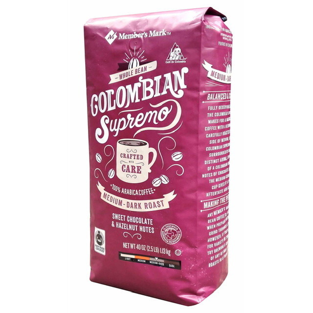 MEMBERS MARK COLOMBIAN FRESH AROMA SUPREMO WHOLE BEAN COFFEE THIS IS MEDIUM-DARK ROAST SWEET CHOCOLATE & HAZELNUT NOTES 100 % ARABICA COFFEE 40 OZ FAIR TRADE CERTIFIED PACKAGING MAY VARY AS THERE IS NEW PACKAGING BUY WITH CONFIDENCE... CHECK OUT MY SELLER RATING... READ MY REVIEWS...IM AN HONEST SELLER WITH QUALITY ITEMS FOR SALE CHECK OUT MY STORE FOR MORE ITEMS LIKE THIS ONE THANKS FOR THE LOOK AND THANKS FOR THE BUSINESS VETERAN OWNED