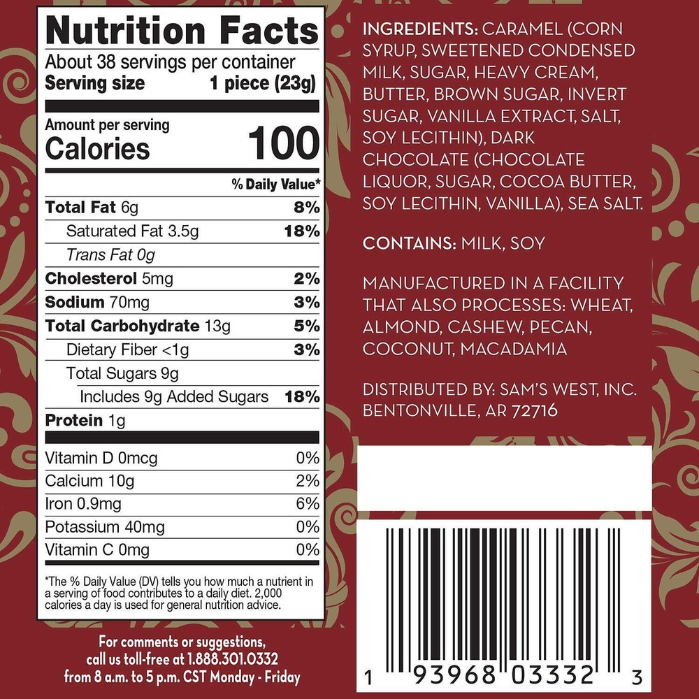 Free eBay listing template designed by dewiso.com Member's Mark Dark Chocolate Soft Sea Salt Caramels, 36 oz. Features and further details Comes in a 36 oz. container Delicious soft caramels infused with crunchy sea salt Expertly crafted with rich kettle-cooked caramel and decadent dark chocolate Offers the perfect blend of sweet and salty flavors Brand MEMBER´S MARK Occasion New Year, Birthday Chocolate Type Dark Flavor Dark Chocolate Unit Count 31 Fluid Ounces Brand MEMBER´S MARK Occasion New Year, Birthday Chocolate Type Dark Flavor Dark Chocolate Unit Count 36Fluid Ounces Net Weight : 36 oz. Includes : 1, 36 oz. jar Ingredients: Caramel (Corn Syrup, Sweetened Condensed Milk (Milk Solids, Sugar), Heavy Cream (Cream, Milk), Butter (Cream, Salt), Brown Sugar (Sugar, Invert Sugar, Cane Molasses), Invert Sugar, Sugar, Vanilla Extract (Water, Ethyl Alcohol, Vanilla Bean Extractives), Salt, Soy Lecithin), Dark Chocolate (Chocolate Liquor, Sugar, Cocoa Butter, Soy Lecithin, Natural Flavor), Sea Salt. Contact us We can be contacted at any time through eBay messages if you have any questions, comments or product requests. We will respond to you within 24 hours and do our best to help you out! We encourage our customers to contact us with any questions or concerns! We'd like to be sure you are completely satisfied with your purchase. Payment Payment throuugh ebay Shipping We are providing free shipping Disclaimer Returns are accaptable .