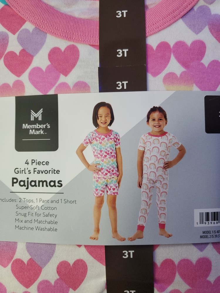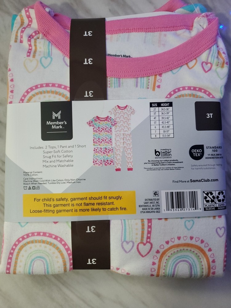 This 4 piece pajama set from Member's Mark is perfect for your little girl's bedtime routine. The set features a heart and rainbow character design, with a multicolor pattern that will make your child's heart skip a beat. The pajamas come in size 3T and are made with high-quality materials to ensure comfort and durability. The set includes a top and bottom with an elastic waistband, as well as a matching hat. When your child puts on these pajamas, they will feel cozy and comfortable, and will be able to sleep soundly throughout the night. This pajama set is a must-have for any little girl who loves to dream about hearts and rainbows.