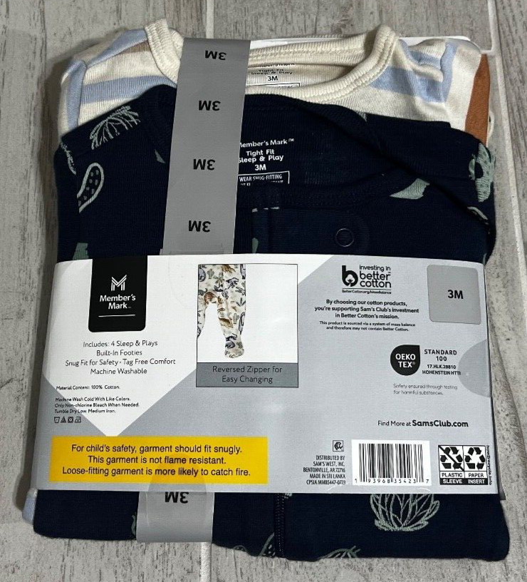 Brand: Member's Mark Material: 100% Cotton Type: One Piece Color: Multicolor Accents: Footie Number of Pieces: 4 Piece Department: Unisex Baby & Toddler Sleeve Length: Long Sleeve Closure: Zip Season: Fall, Spring, Winter Size: 3 Months