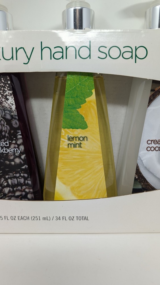 Try out this luxury Hand soap variety pack from Member's Mark. All soaps are brand new never used. Each bottle 8.5 fl oz or 251 mL. Fragrances include: Classic Cranberry, Frosted Blackberry, Lemon Mint, and Creamy Coconut. If you have any questions, just ask. Thank you for looking.