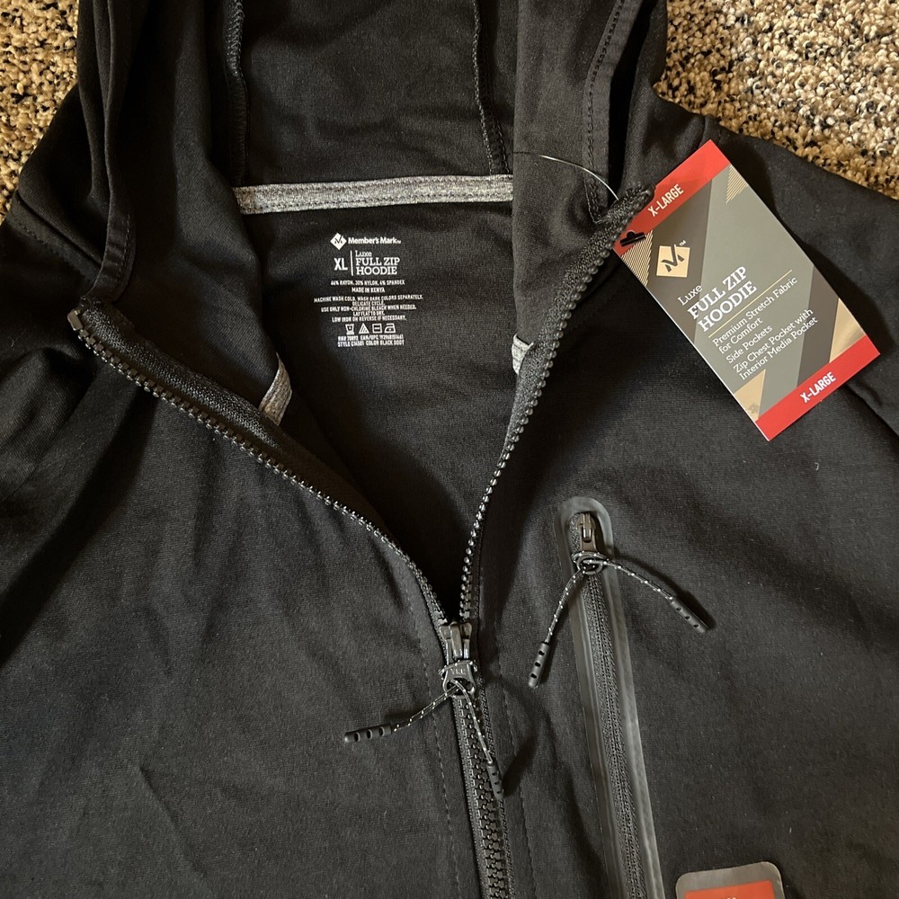 Elevate your style with this sleek black hoodie jacket from Member's Mark. Crafted from high quality materials, this jacket is perfect for men who want to look their best while staying comfortable. Featuring a full zip design and a hood, this jacket is perfect for any occasion. With its XL size, it's perfect for those who want a relaxed and comfortable fit. This jacket is perfect for anyone who wants a stylish and comfortable addition to their wardrobe. The jacket is new with tags and is made from high-quality materials, ensuring that it will last for years to come. Whether you're out running errands or just hanging out with friends, this jacket is sure to keep you warm and looking great. New. See pictures.