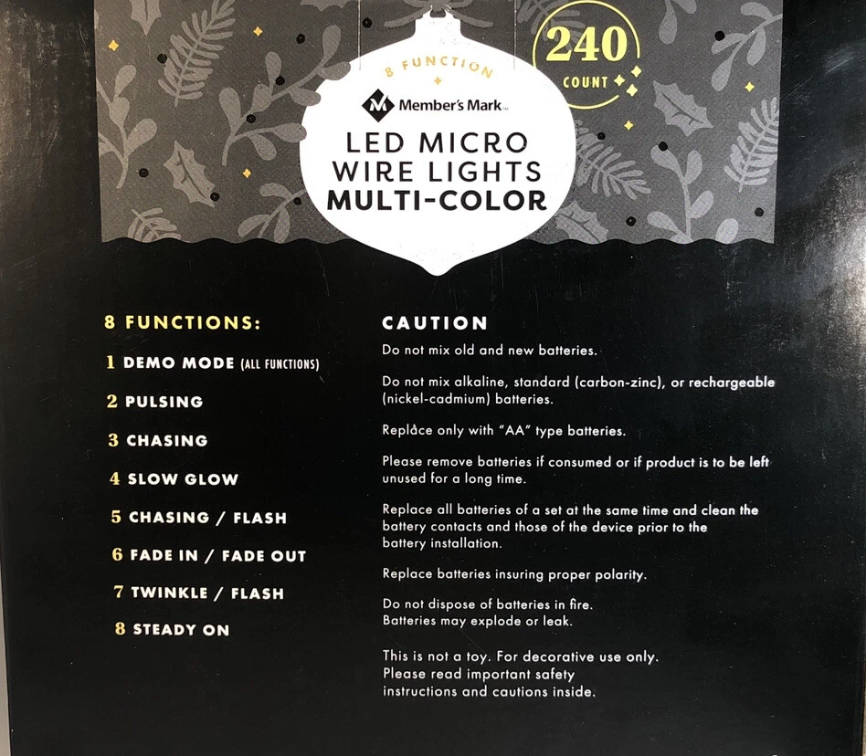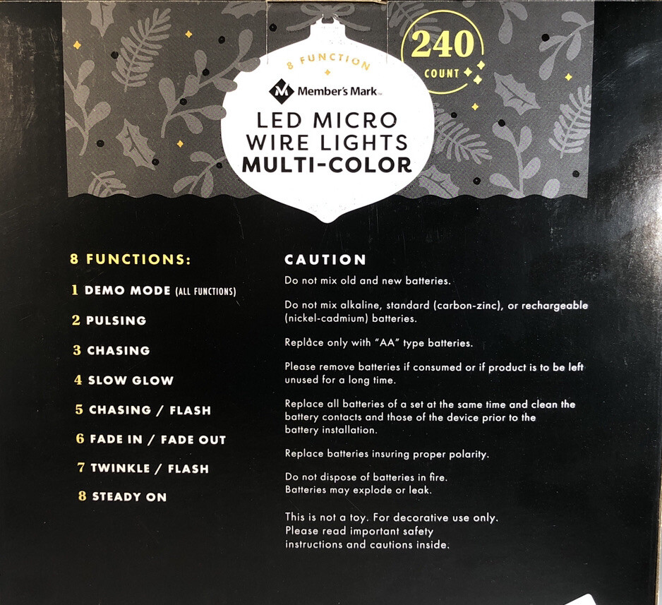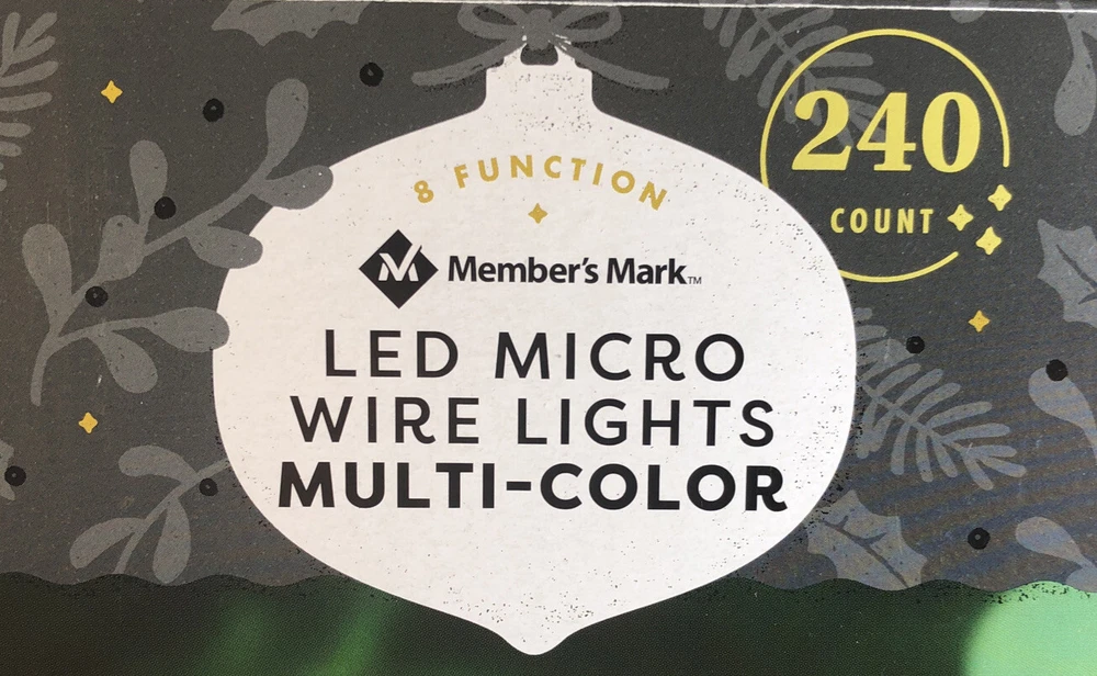 Members Mark Micro LED Wired Lights 240 Count 8 Function! 12 AA Batteries Included!. Condition is Brand New. Brand: Members Mark Model: 240ct Micro LED Wired Lights Shipped with USPS Priority Mail . You Will Receive 1 ea Members Mark Micro LED Wired Lights 240 Count 8 Function! 12 AA Batteries Included!. RARE VINTAGE COLLECTIBLE SHIPS N 24 HOURS Packed By Our Award Winning Packaging And Shipping Department Long Time E-commerce Seller For Over 20 Years LIMITED AVAILABILITY Follow Our EBay Store For All New Rare Products Posted Daily and Specials Please click https://www.ebay.com/usr/boughtnowcommerce Inventory Box Number: Timer function: 6 hours on, 18 hours off 8 unique functions to create your own light show Indoor/outdoor use Add some festive fun to your interior or exterior decorations with these LED Multifunction Wire Lights. Complete with timer function and eight unique settings, these lights are sure to give your winter wonderland variety all season long. Specifications Light count: 240 ct. (4 sets of 60 each=240 ct.). Light length: 78' Total length: 82' 12" x 4" silver copper wire. Includes (12) AA batteries