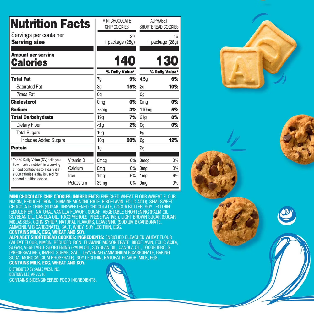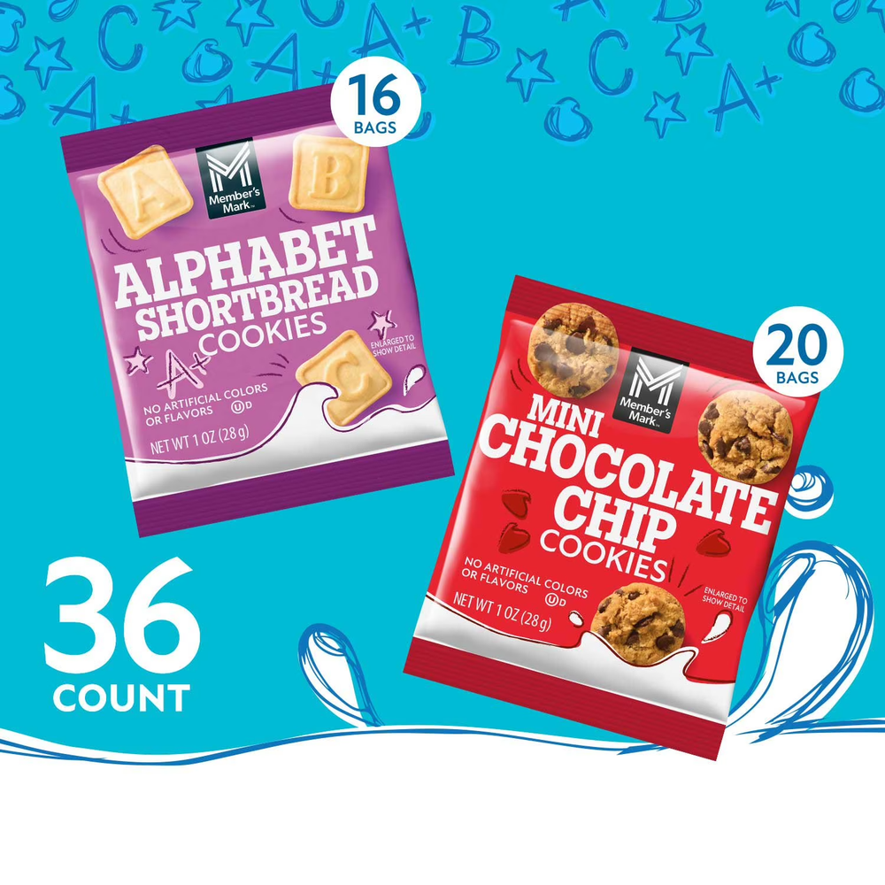 Members Mark Mini Cookies Variety Pack, 1 oz., 36 pk. Free Shipping About this item Delightful Mini Cookies Experience the joy of snacking with our Mini Chocolate Chip and Alphabet Cookie Variety Pack. These bite-sized treats are perfect for both kids and adults. The pack includes delicious chocolate chip cookies that are bursting with rich, chocolatey flavor. Also included are whimsical shortbread cookies, uniquely shaped like letters for a playful and fun twist. No Artificial Ingredients These cookies are made with no artificial colors or flavors, ensuring a snack that you can feel good about. Each cookie is crafted with care, using only quality ingredients. This means you can indulge your sweet tooth without any guilt. Perfectly Portioned Our Mini Chocolate Chip and Alphabet Cookie Variety Pack is conveniently portioned for easy snacking on the go. Whether you're packing a lunchbox, planning a party, or simply in need of a sweet pick-me-up, these cookies are the perfect choice. Enjoy a delightful snack experience anytime, anywhere. Indulge in Variety With our Mini Chocolate Chip and Alphabet Cookie Variety Pack, you get to enjoy the best of both worlds. The rich, chocolatey goodness of mini chocolate chip cookies and the fun, playful nature of alphabet cookies. Indulge in variety, enjoy the fun.