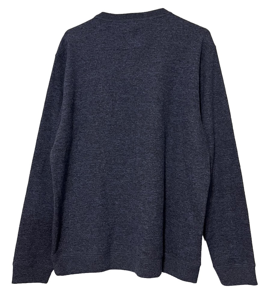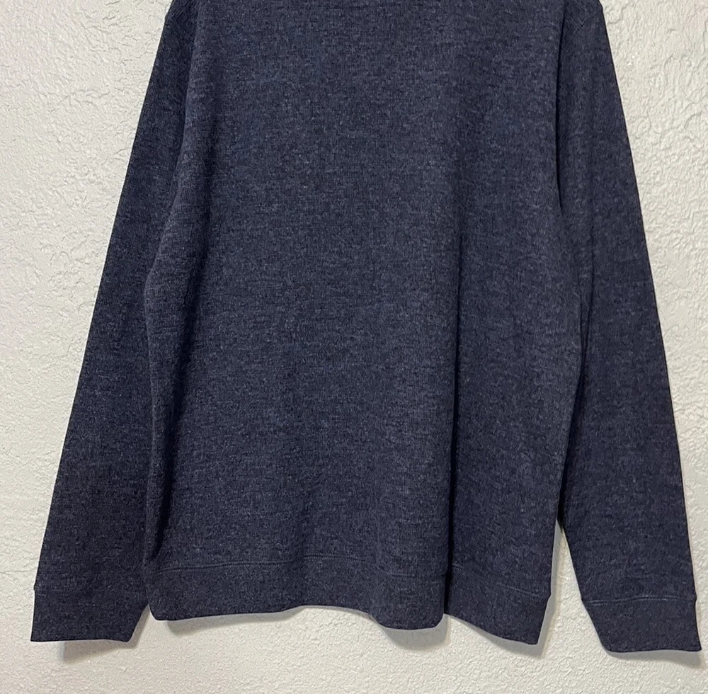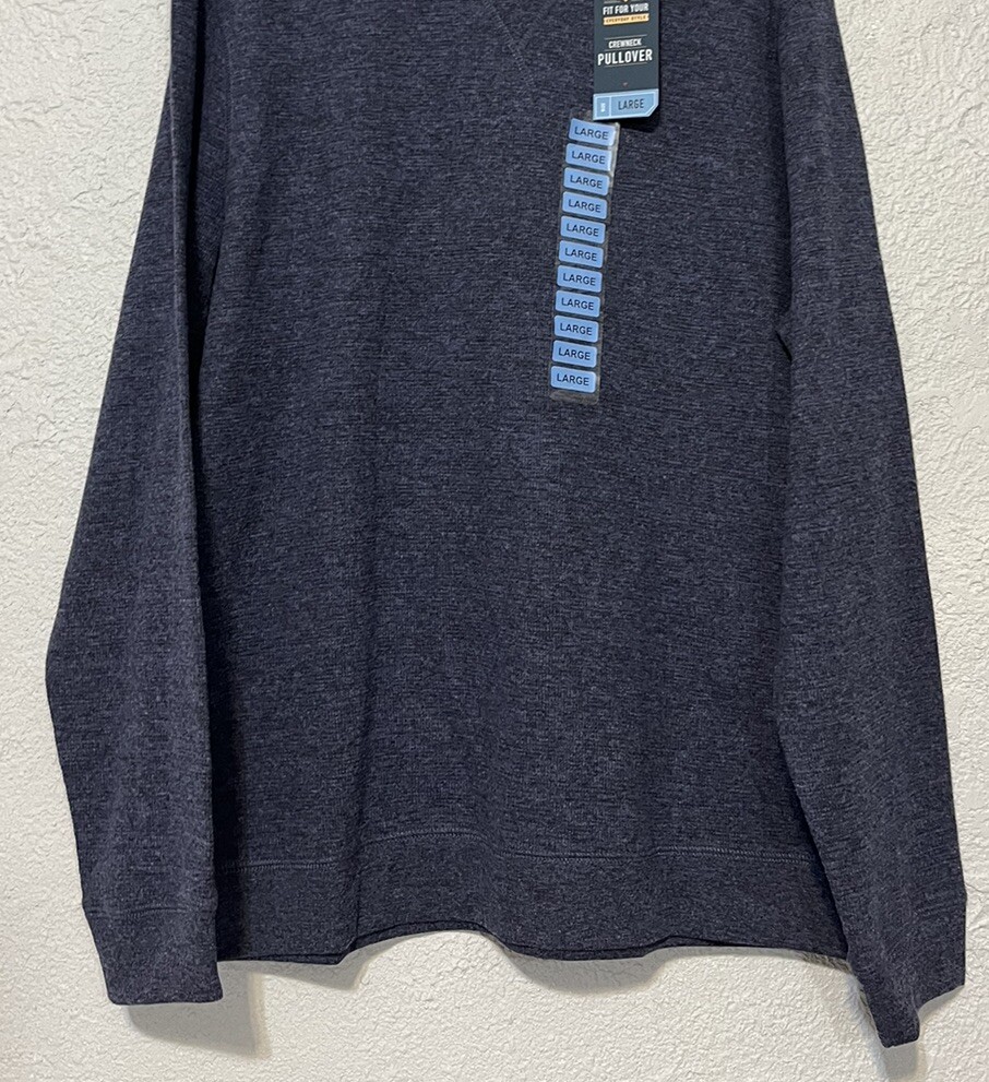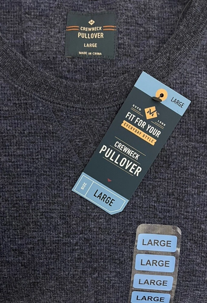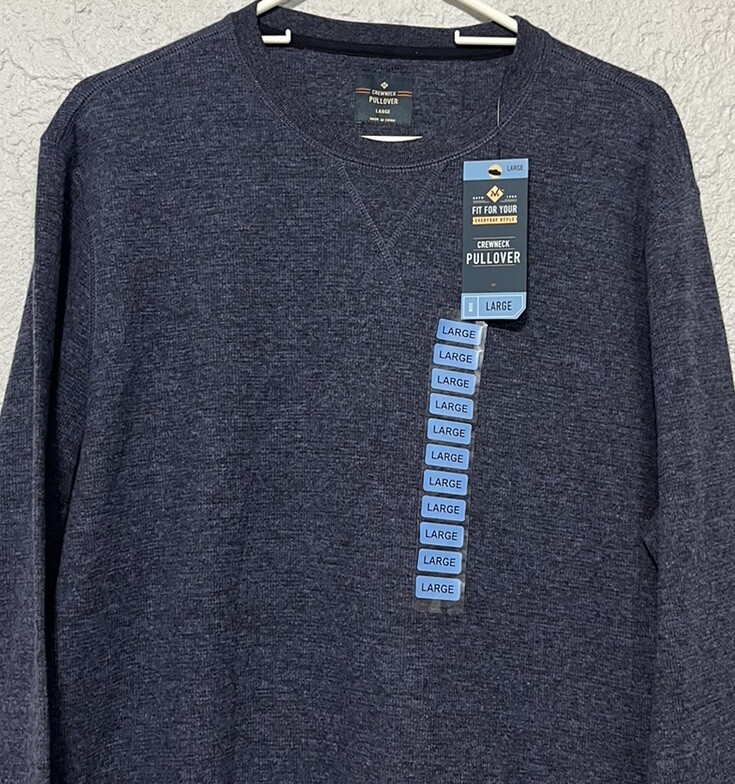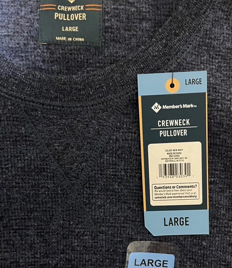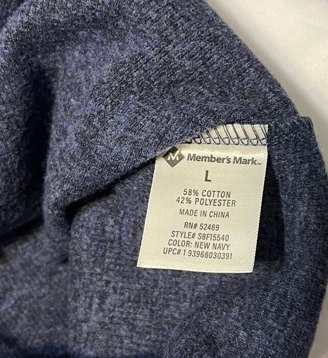 This is a navy blue pullover crew neck sweater for men, made by Members Mark. It is made of a cotton blend material with a tight-knit fabric type and features a v neck stitching accent. The sweater has long sleeves and a regular fit, with a lightweight design suitable for winter, summer, fall, and spring. It is available in size large and is machine washable. The sweater is versatile and can be worn for travel, party/cocktail, casual, workwear, or business occasions, as well as for walking, golf, work, or hiking.