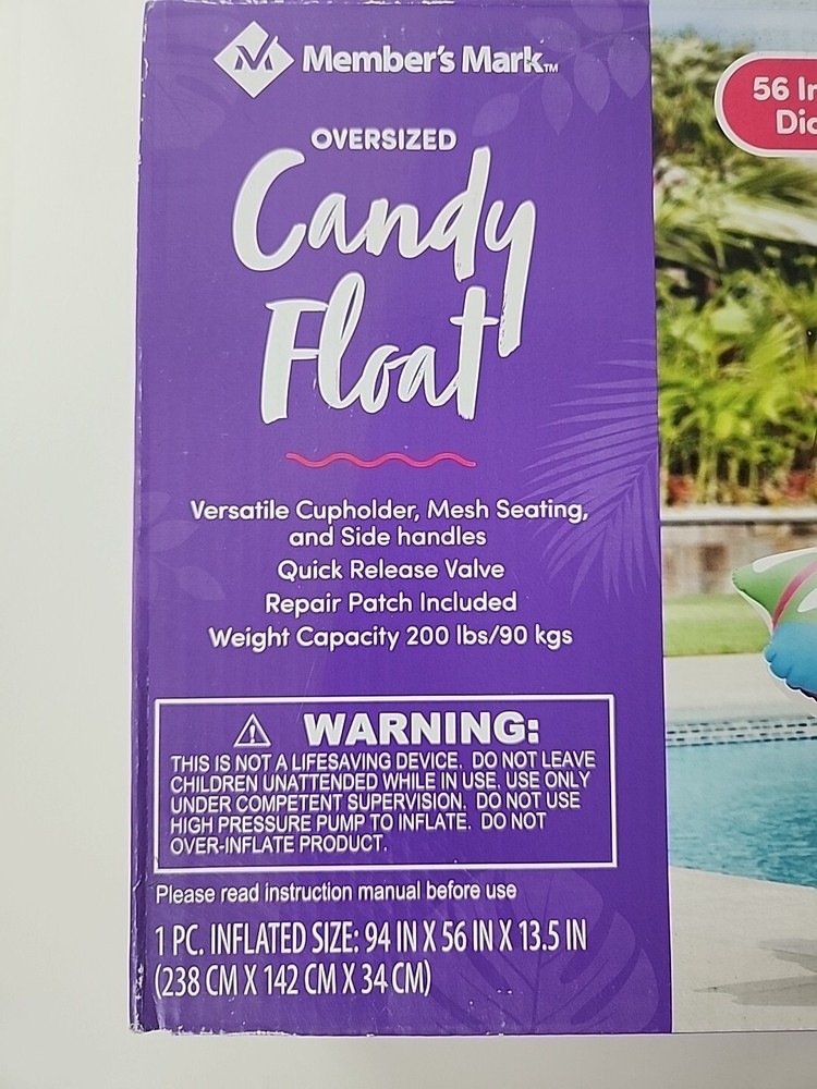 When you want big summer fun, grab the Member's Mark 56" Ring Float and head to the pool. This larger-than-life float comes in 6 fun designs. Pick your favorite from Turtle, Unicorn, Shark, Parrot, Fish and Crab. Then, grab your friends and get floating! Color ['Turtle', 'Unicorn', 'Shark', 'Parrot', 'Fish', 'Crab'] ['Turtle', 'Unicorn', 'Shark', 'Parrot', 'Fish', 'Crab'] Brand MEMBER´S MARK Material Polyvinyl Chloride UPC 193968187156 Manufacturer Member's Mark CONDITION: New, unopened