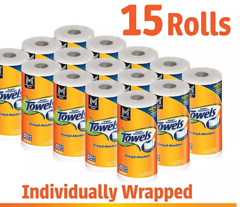 **FREE 1-2 DAY SHIPPING! WILL HAVE ITEM DELIVERED WITHIN 24-48 HOURS OF ORDER PLACEMENT, FREE OF CHARGE! MESSAGE FOR ANY QUESTIONS!** Member’s Mark Super Premium 2-Ply Select & Tear Paper Towels are designed for maximum absorbency, strength, and versatility. This bulk pack includes 15 mega rolls, each with 150 sheets, providing a reliable solution for cleaning up spills, wiping surfaces, and tackling household messes. Key Features 2-Ply, Quilted Design: Offers a perfect balance of strength and absorbency, making these towels suitable for tough spills and delicate surfaces alike. Select & Tear Perforations: Allows you to choose the exact sheet size needed, reducing waste and increasing efficiency. Strong & Durable: Thick, long-lasting sheets hold up to scrubbing and heavy-duty cleaning without falling apart. Gentle on Surfaces: Safe for use on glass, appliances, countertops, dishes, tile, and more. Bulk Value: 15 mega rolls per pack ensure fewer trips to restock and long-lasting use. Sheet Size: Each sheet measures 11" x 6", ideal for a variety of cleaning tasks. Total Sheets & Area: 2,250 sheets per pack (15 rolls x 150 sheets), totaling approximately 1,031 square feet .