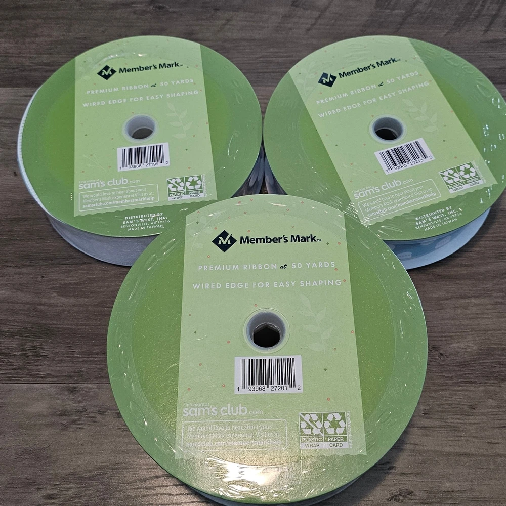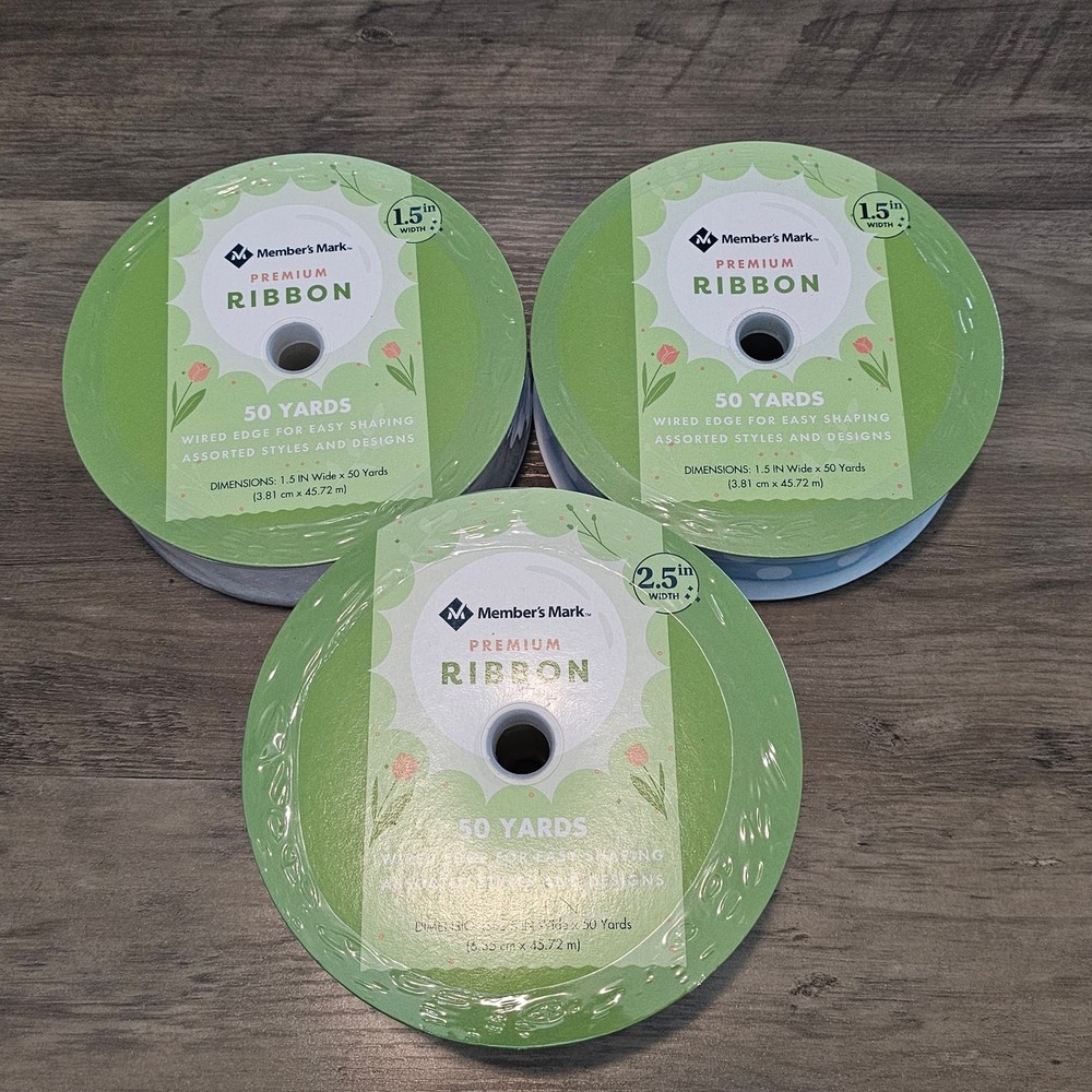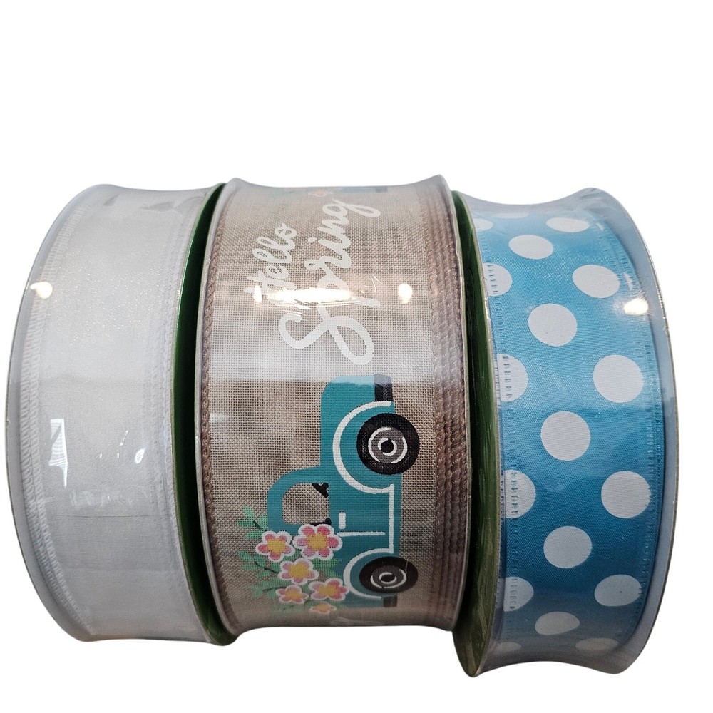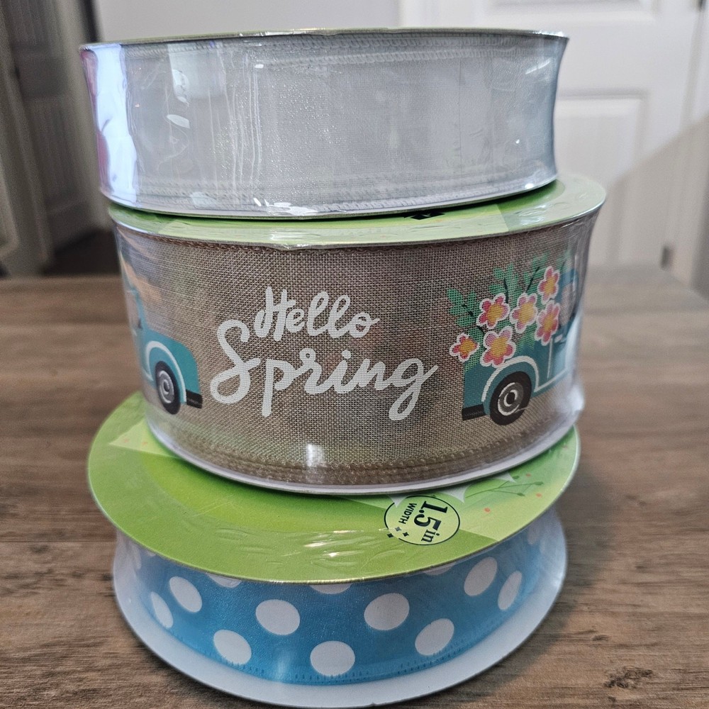 Members Mark Ribbon 50 Yrds Wired Spring 1.5" 2.5" 3 Set Blue Truck Polka Dot -New in package -1 ribbon that is white and shiny, one tan with a blue truck that says Hello Spring, and one blue with white polka dots. -50 yards in length by 1.5" width x 2 types of ribbons and one that is 2.5" -Wired edge for easy shaping -Bows, crafts, wreaths, presents, holidays, Spring. Easter, neutral, traditional, farmhouse, cottage Measurements in photos. Same day / next day shipping Offers accepted Like for price drops and deals Bundle 2 items or more and save! Thank you! 2lb 10oz CL