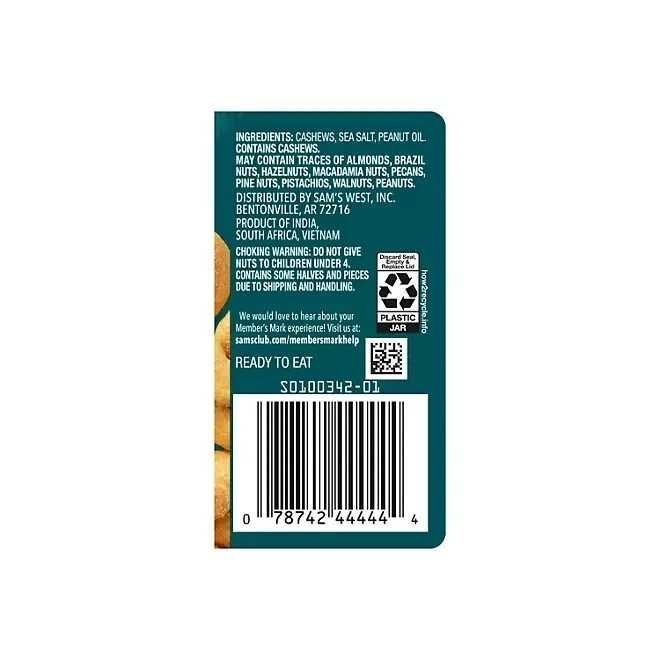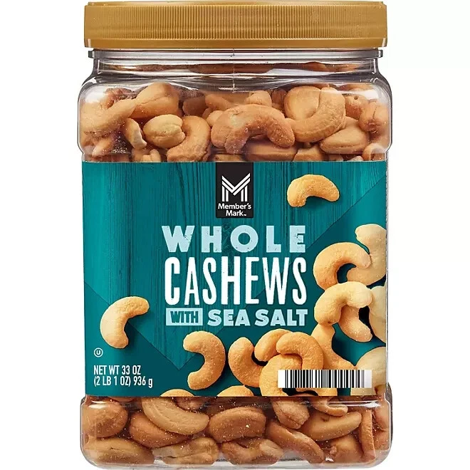 Member's Mark Roasted Whole Cashews with Sea Salt, 33 oz. Highlights 33-oz canister of whole salted cashews Seasoned with sea salt for enhanced flavor Ideal for parties, gatherings, or as a snack Kosher certified Give your family and friends a classic snack with this Member's Mark™ Roasted Whole Cashews with Sea Salt. This sizable jar is ideal for sharing with others. What’s in this Jar of Member's Mark Roasted Whole Cashews with Sea Salt? This selection consists of whole cashews with sea salt. Rich with flavor, these high-quality nuts may become a favorite in your household. What Can I Do with Member's Mark Roasted Whole Cashews with Sea Salt? Although they’re delicious enough to eat plain, you can mix your salted cashews with other dishes to enhance their flavor, too. For instance, if you’re fond of baking, you can place these dry roasted cashews within the batter, giving your muffins, cookies and cakes a satisfying crunchiness. Using these cashews as a topping for ice cream, brownies and other desserts can be tasty as well. Do These Salted Cashews Offer Nutritional Benefits? Salted cashews are a good source of protein and healthy, natural fats that can offer potential health benefits. It can also provide essential nutrients that your body needs to maintain good health. With these cashews, you have a healthier option to enjoy.