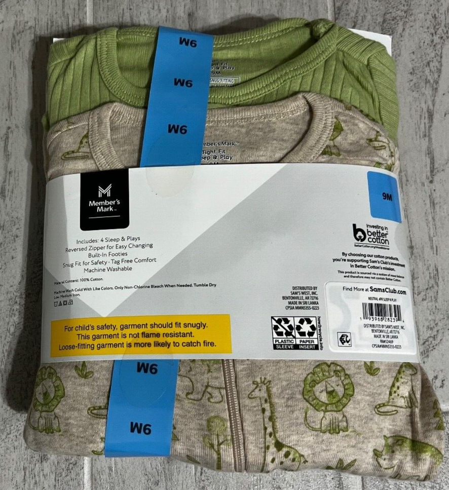 Size: 9 Months Material: 100% Cotton Sleeve Length: Long Sleeve Accents: Footie Type: One Piece Brand: Member's Mark Closure: Zip Department: Unisex Baby & Toddler Season: Fall, Spring, Winter Color: Multicolor Number of Pieces: 4 Piece