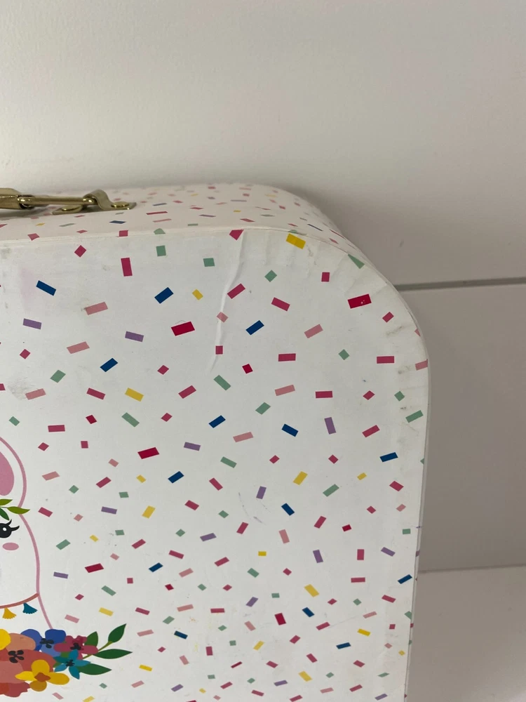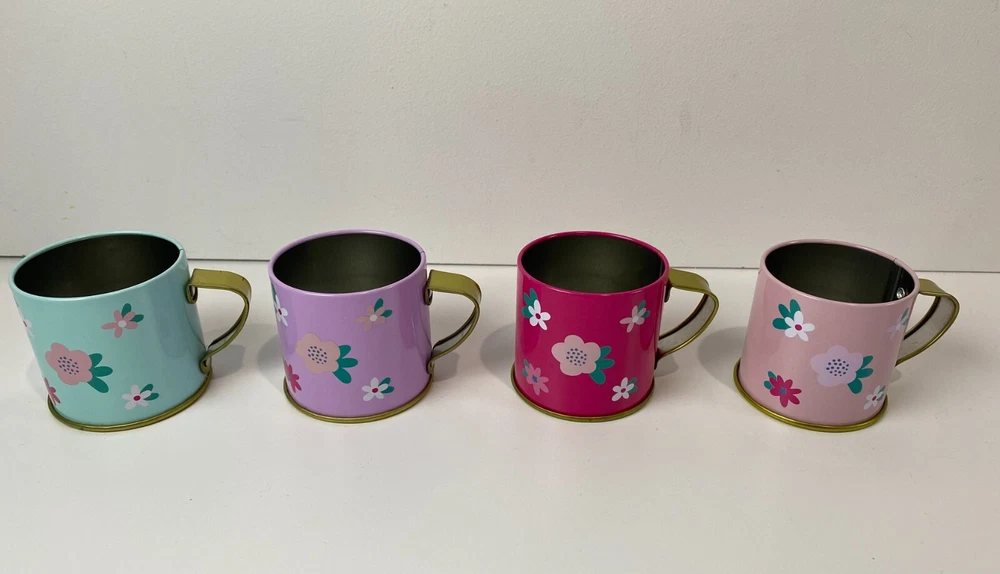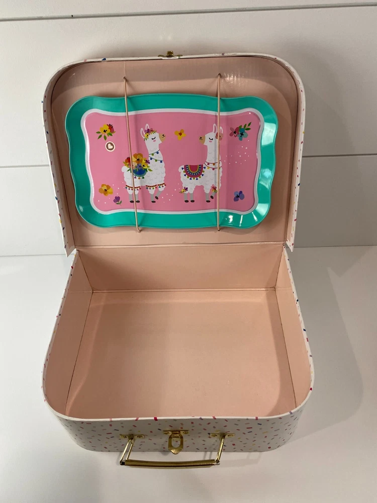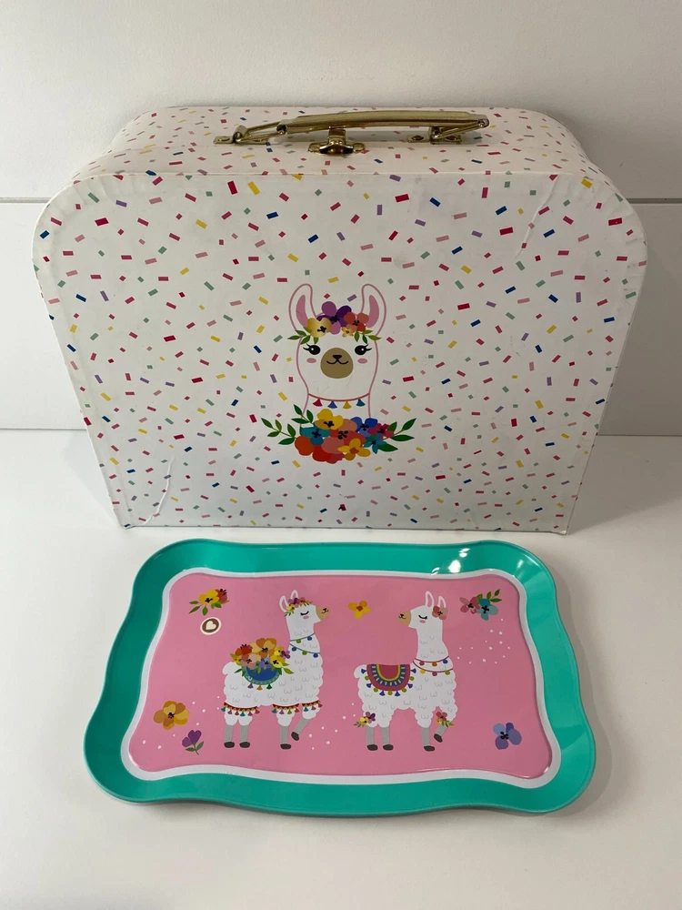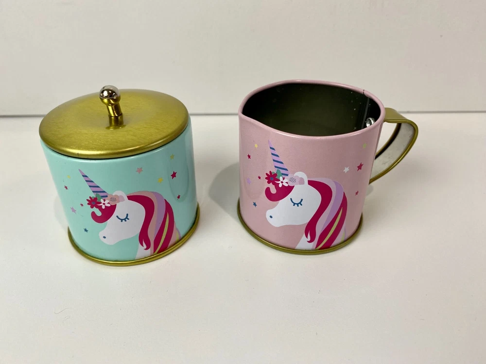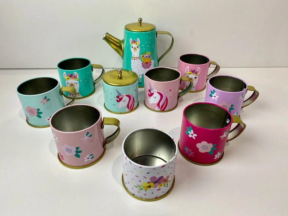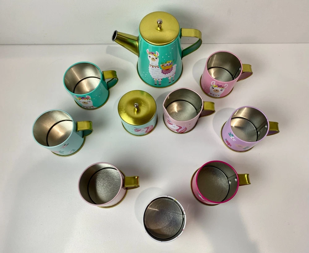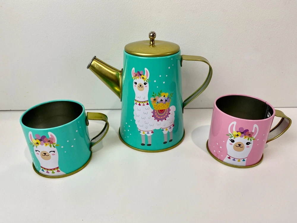 Members Mark, metal pretend play tea set. This is a mixed lot of different styles, but they all have the same colors and go well together. Some have a Llama, Unicorn or Flowers. Lightly played with condition. The paint on these is really good with just a few tiny dots of missing paint on the dark pink cup and the creamer dish has a little bit of a bend to the metal. Nothing at all major, just wanted to mention it and I included close ups of both. What is shown is the set you will get. There are two sugar dishes, but only one lid. Clean and smoke free. Teapot measures approx. 3 3/4" tall and the cups are 1 7/8" tall. Note: I found the Llama tray and Storage/Carrying Box that goes with these after taking pictures. I have added the additional pictures with these two items. The tray has a little bend in the metal and the case has some minor creasing in the corners, but they are clean and otherwise is great condition.