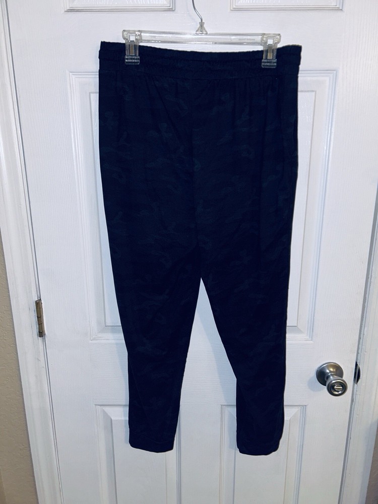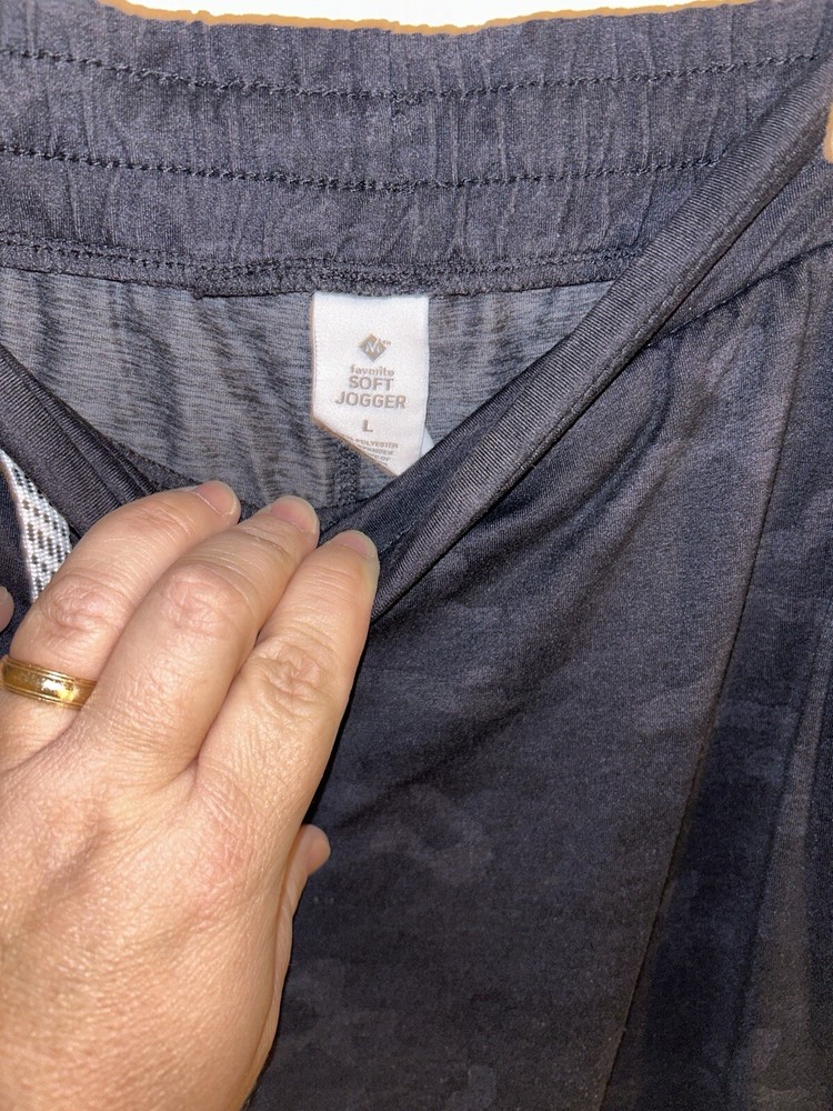 Fit: Relaxed Brand: Member's Mark Occasion: Activewear Theme: American Personalize: No Handmade: No Style: Jogger Season: Fall, Spring, Winter Country/Region of Manufacture: China Closure: Pull On Size Type: Regular Pattern: Camo Size: L Type: Pants Color: Black Inseam: 28.5 in Garment Care: Machine Washable Fabric Type: Blended Fabric Material: Polyester Blend Performance/Activity: CrossFit, Cross Training, Gym & Training, Running & Jogging, Walking Vintage: No Department: Women Features: Comfort, Pockets